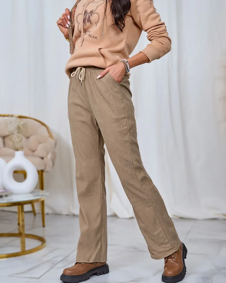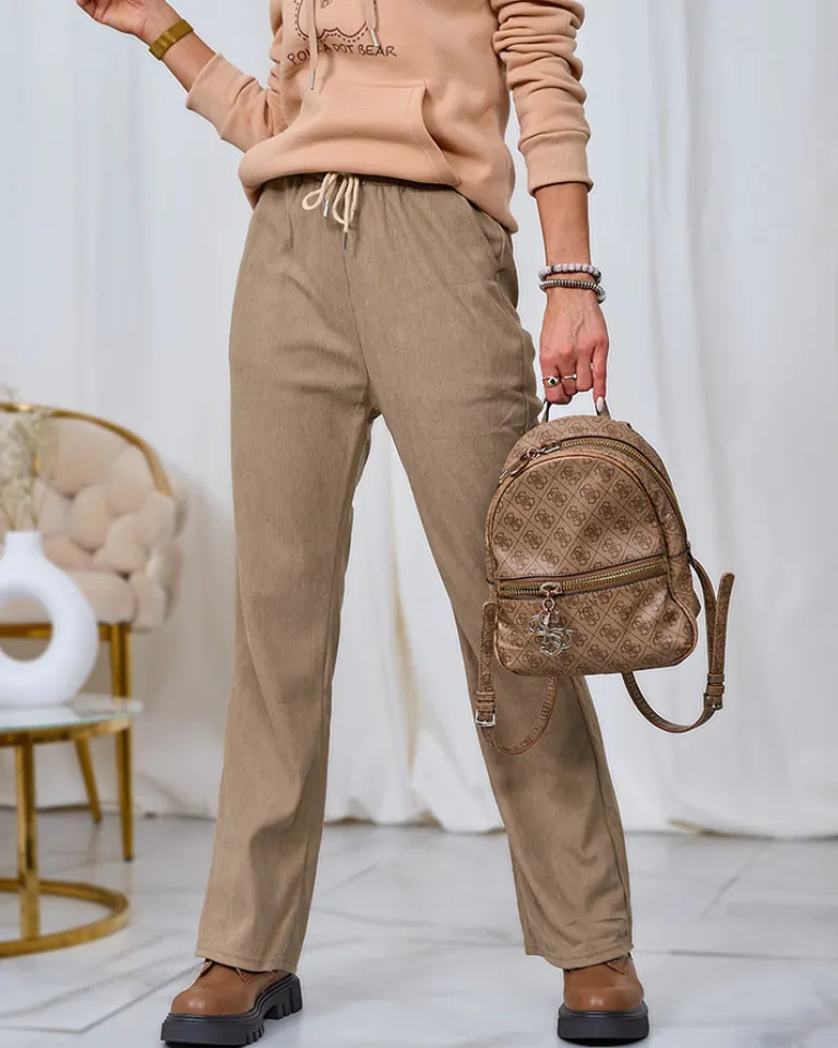 - Mega stylowe szerokie spodnie materiałowe wykonane z miękkiej tkaniny sztruksowej. Elastyczna guma w pasie z regulowanymi troczkami pozwala na dostosowanie spodni do swojego indywidualnego kształtu. Dodatkowo, dwie wsuwane kieszenie z przodu.