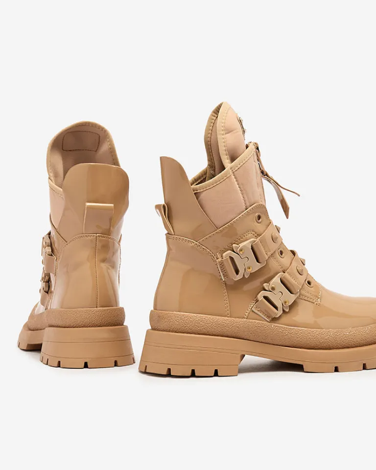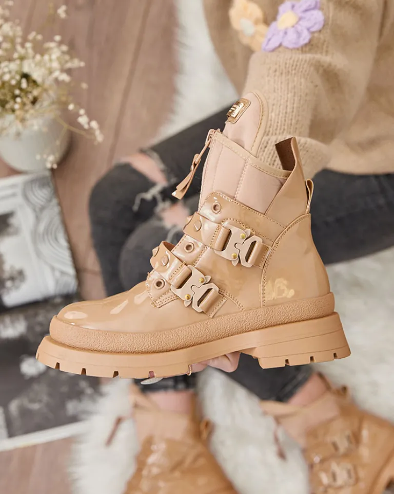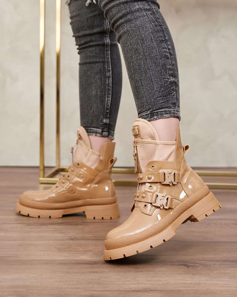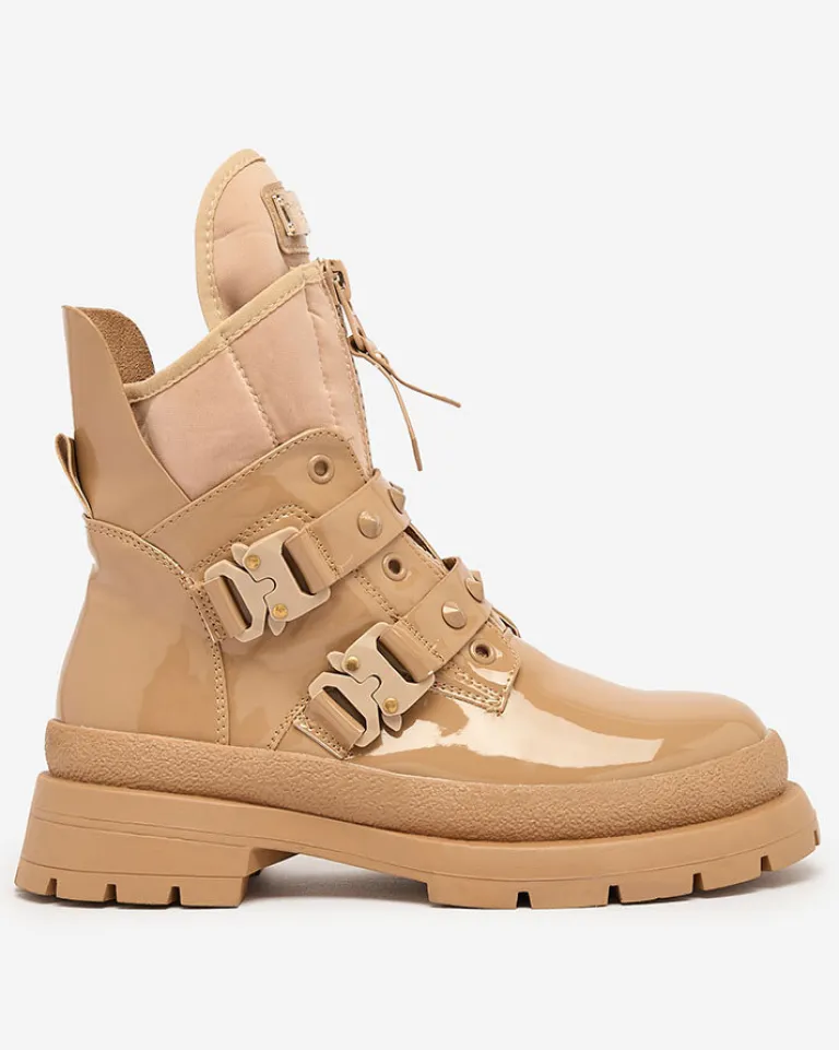 - Botki workery damskie to wyjątkowe obuwie łączące w sobie styl i wygodę. Wykonane z połączenia eko skóry lakierowanej oraz tkaniny, posiadają po środku suwak i paski z dżetami, które dodają butom charakteru i oryginalności.