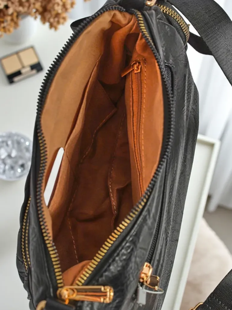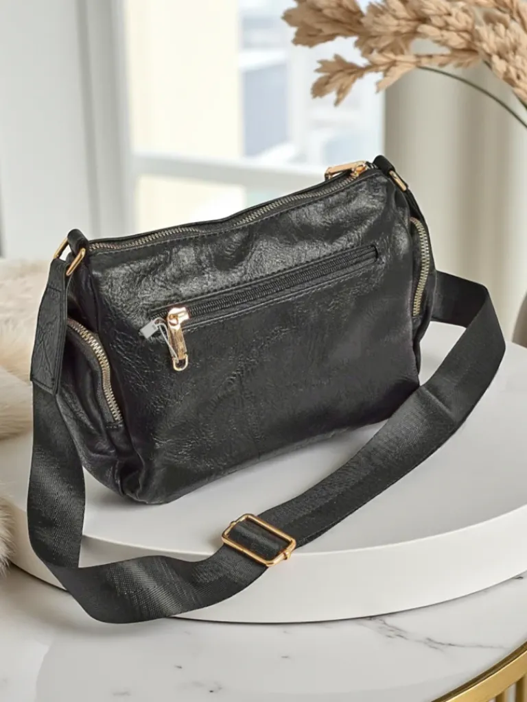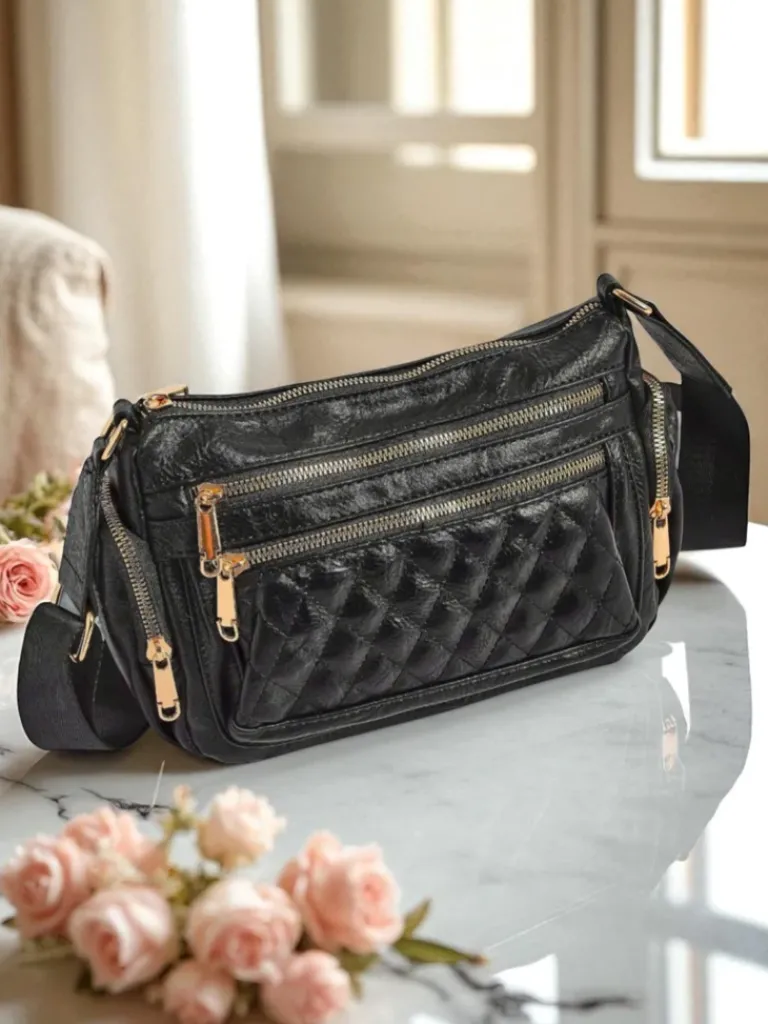 - To kompaktowa torebka z eko skóry z pikowaną kieszonką. Ma 1 komorę, 4 kieszenie i regulowany pasek. Dodatkowo 2 kieszonki po bokach. Stylowa i praktyczna – idealna na co dzień i wyjścia.