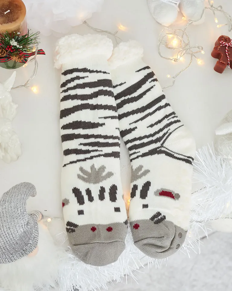 - Przepiękne damskie grube skarpety wykończone printem. W środku ocieplane białym, cieplutkim kożuszkiem. Skarpetki świetnie się sprawdzą na chłodniejsze wieczory!