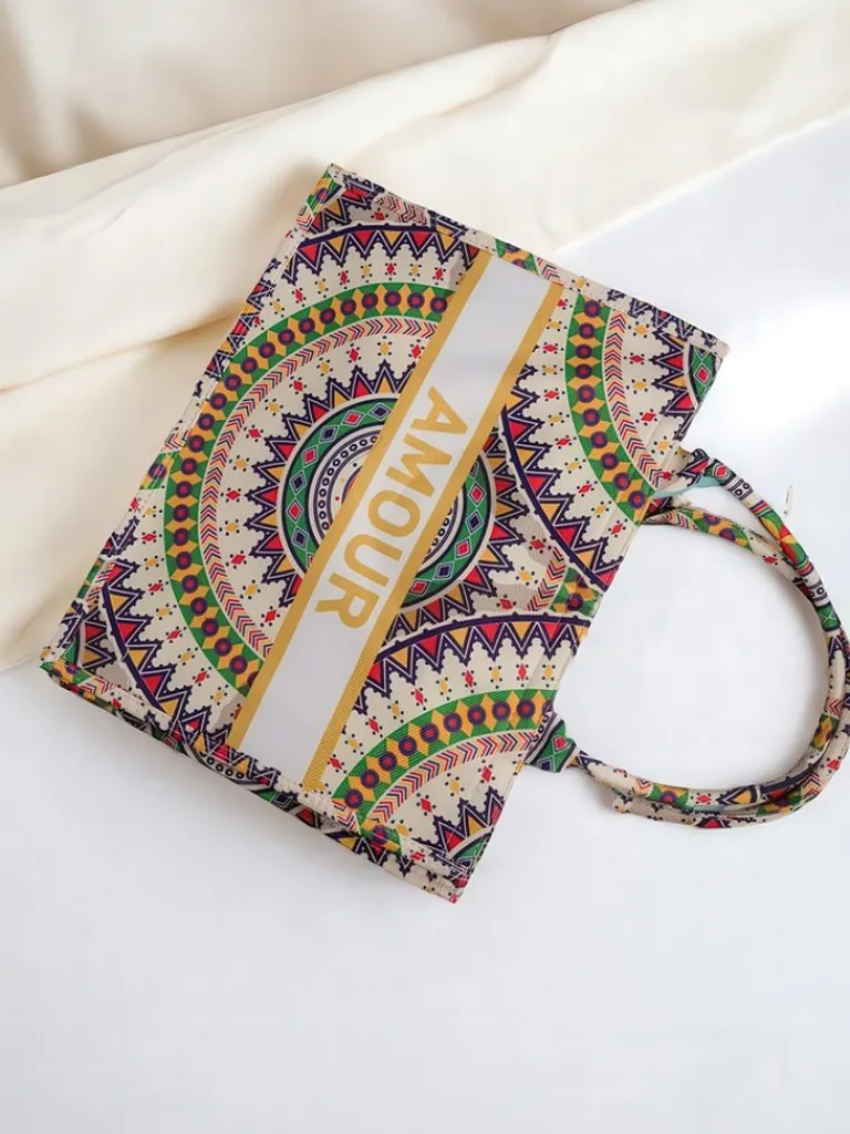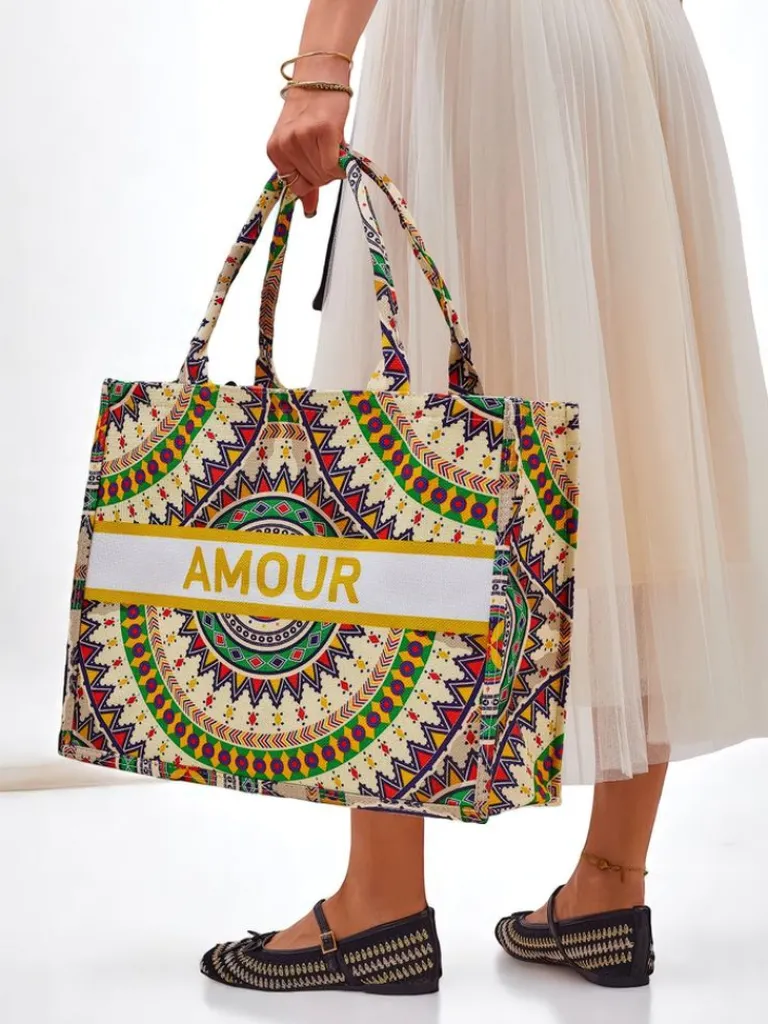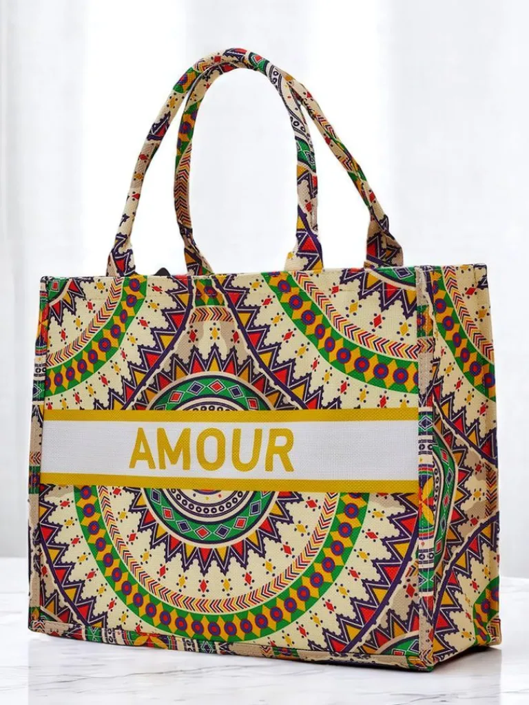 - Duża, materiałowa torebka damska z wzorzystym motywem i napisem AMOUR. 1 komora, zamek. Lekka, pojemna i stylowa – idealna na co dzień i letnie wyjścia!