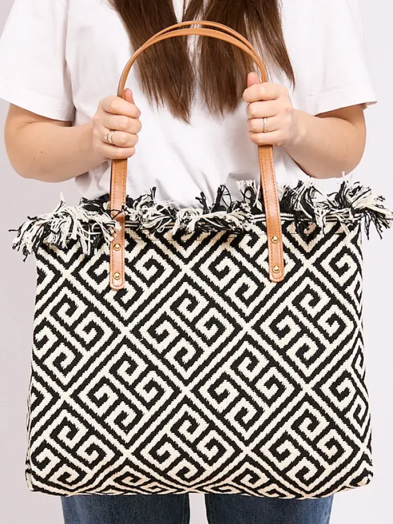 - Wzorzysta pleciona torebka shopper . Produkt zapinany na zamek, w środku posiada kieszonkę na suwak. Bardzo efektowny dodatek.
