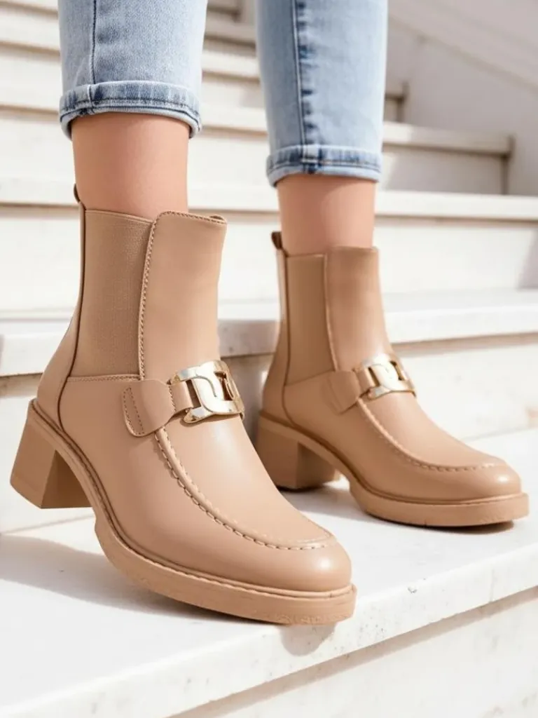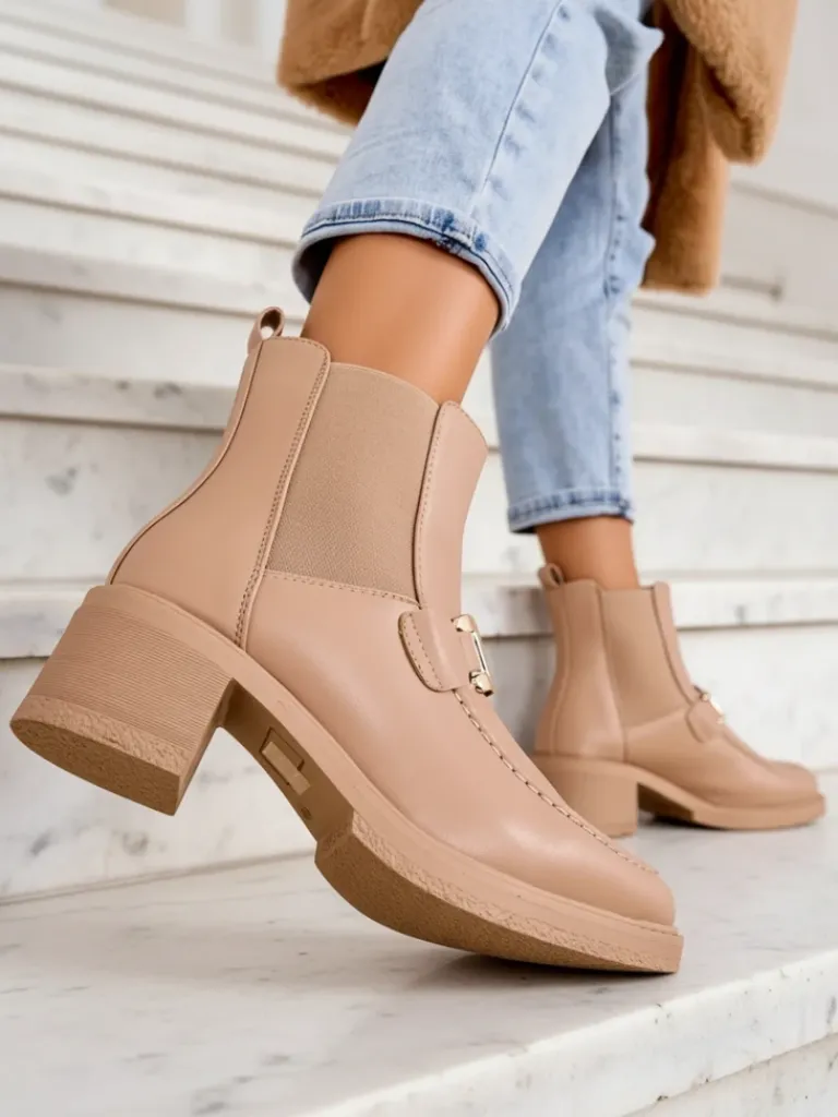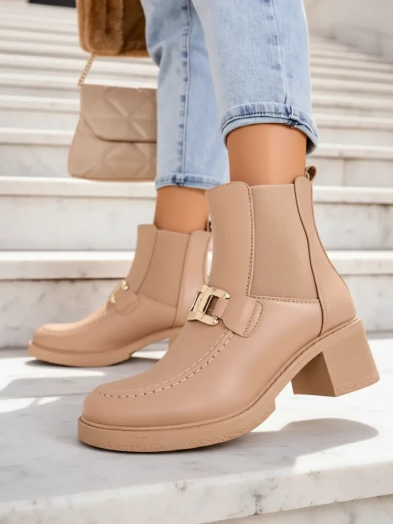 - Stylowe damskie botki na niskim słupku. Cholewka wykonana ze skóry ekologicznej. Środek wypełniony delikatnym futerkiem. Model posiada subtelną ozdobę na cholewce. Obuwie wsuwane, nosek okrągły. Świetny wybór na jesień!