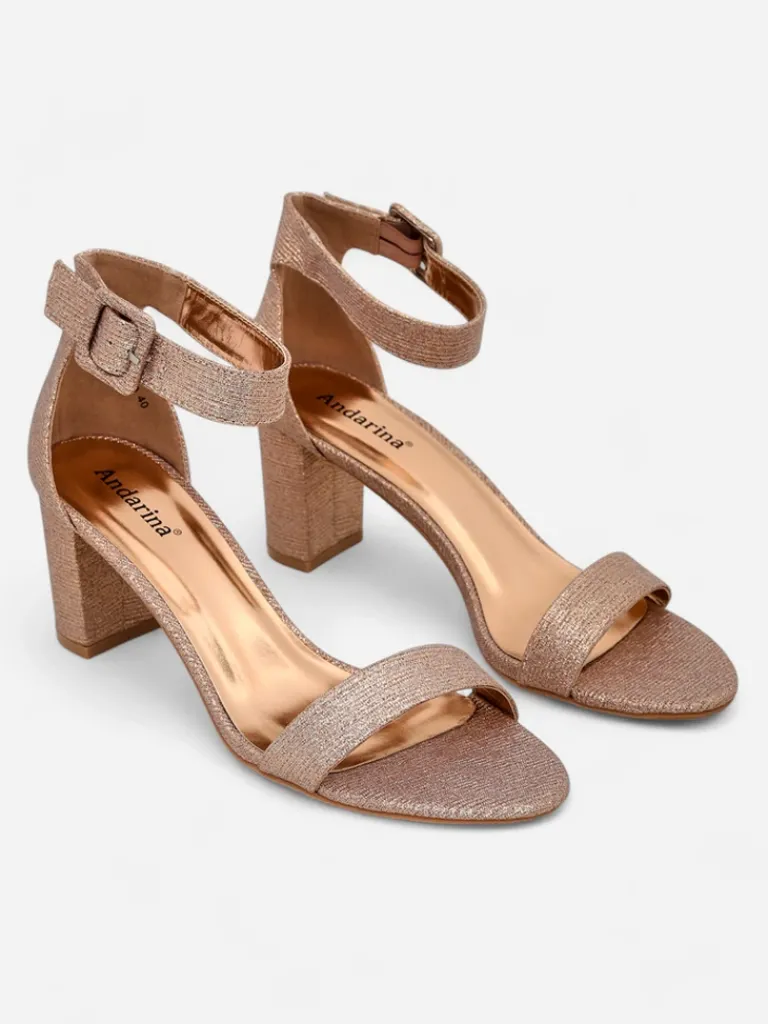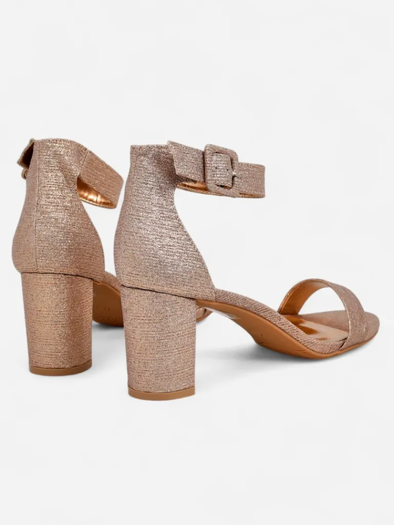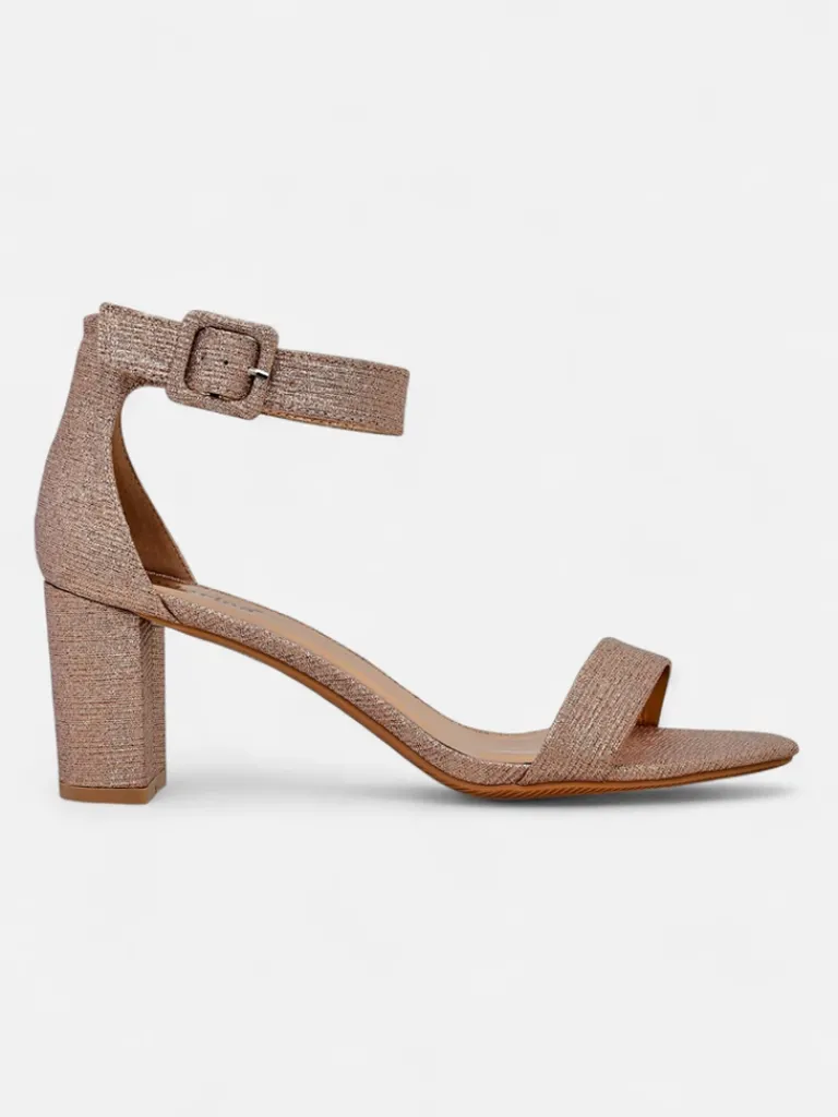 - Damskie sandałki na słupku – to idealny pomysł na gorące letnie dni. Model wykonany z tkaniny z brokatem i eko skórzanej wkładki. Obuwie zapinane na sprzączkę. Połączenie stylu i wygody!
