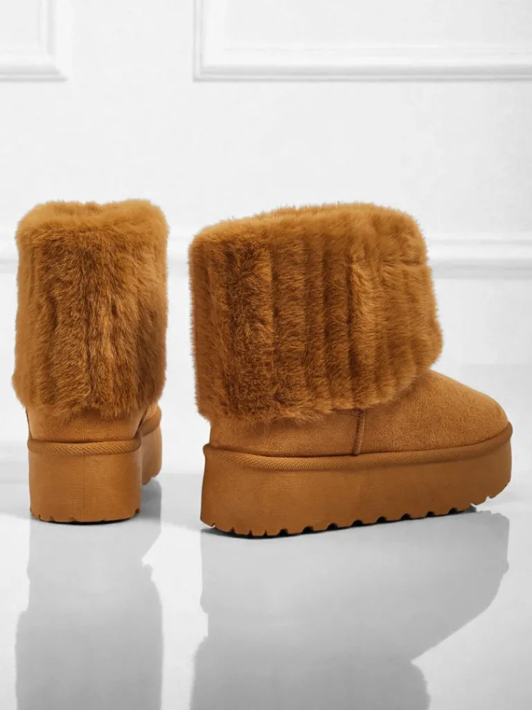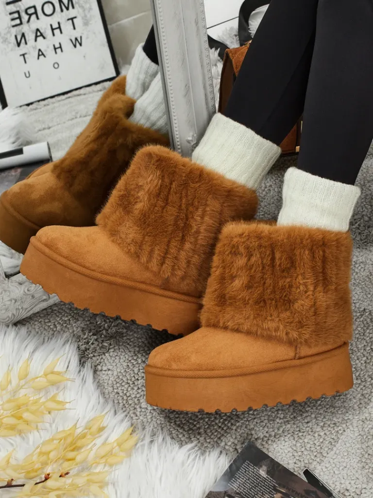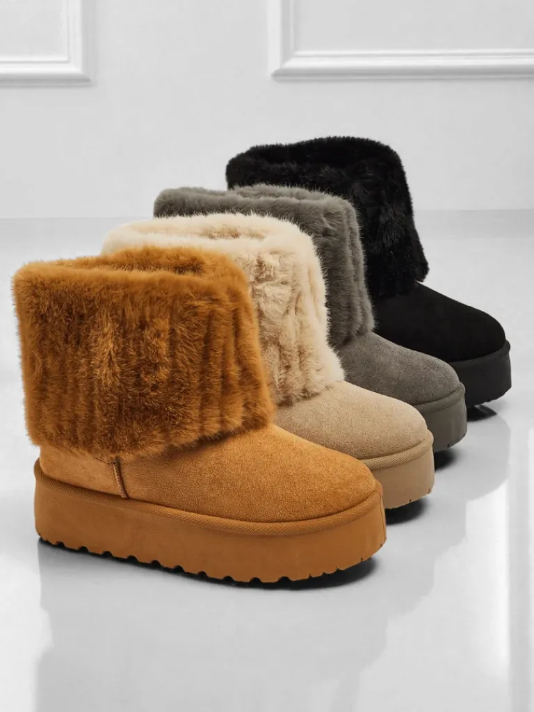 - Świetne damskie zimowe buty typu śniegowce na grubszej podeszwie typu platforma. Cholewka wykonana jest ze skóry ekologicznej zamszowej, środek ocieplony futerkiem. Idealna baza na zimę!