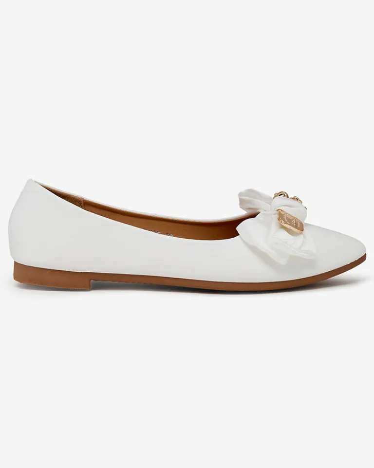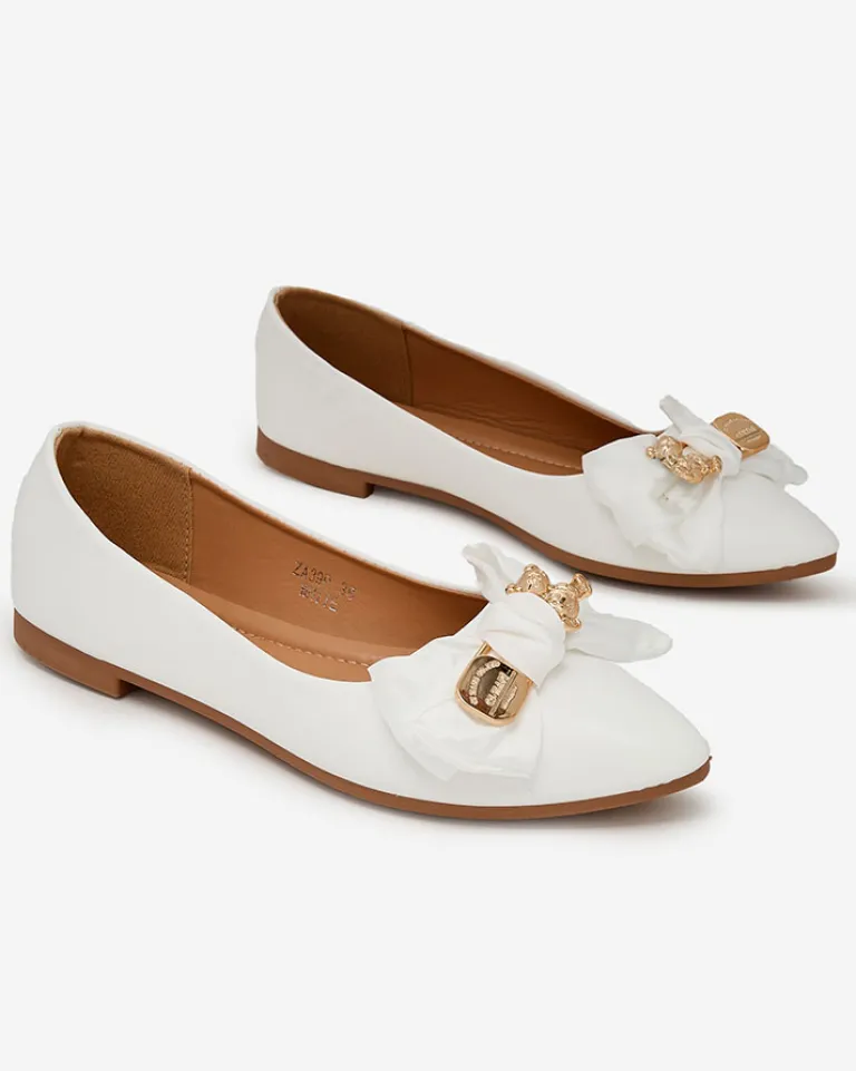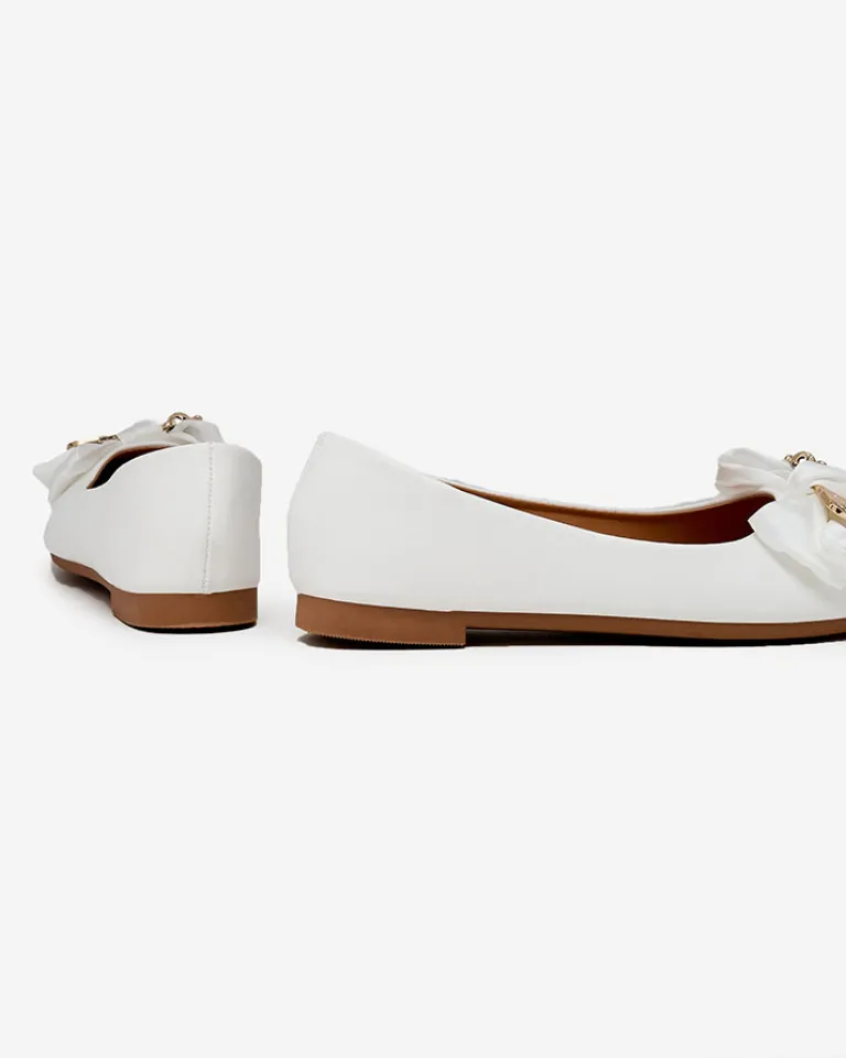 - Balerinki damskie na płaskim obcasie wykonane w całości ze skóry ekologicznej. Nosek w szpic i zdobiony kokardką. Super dodatek do Twoich casualowych outfitów!