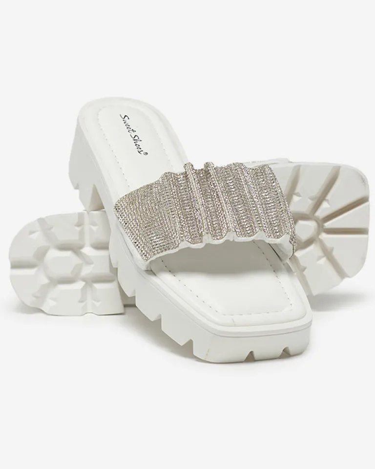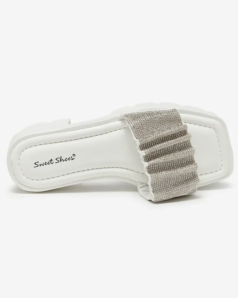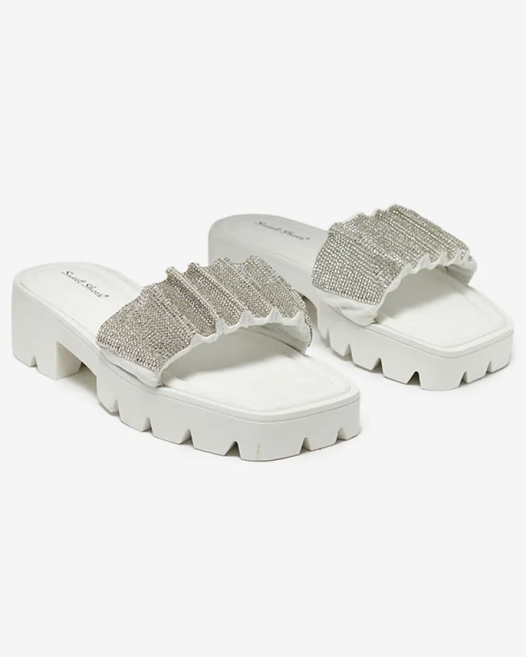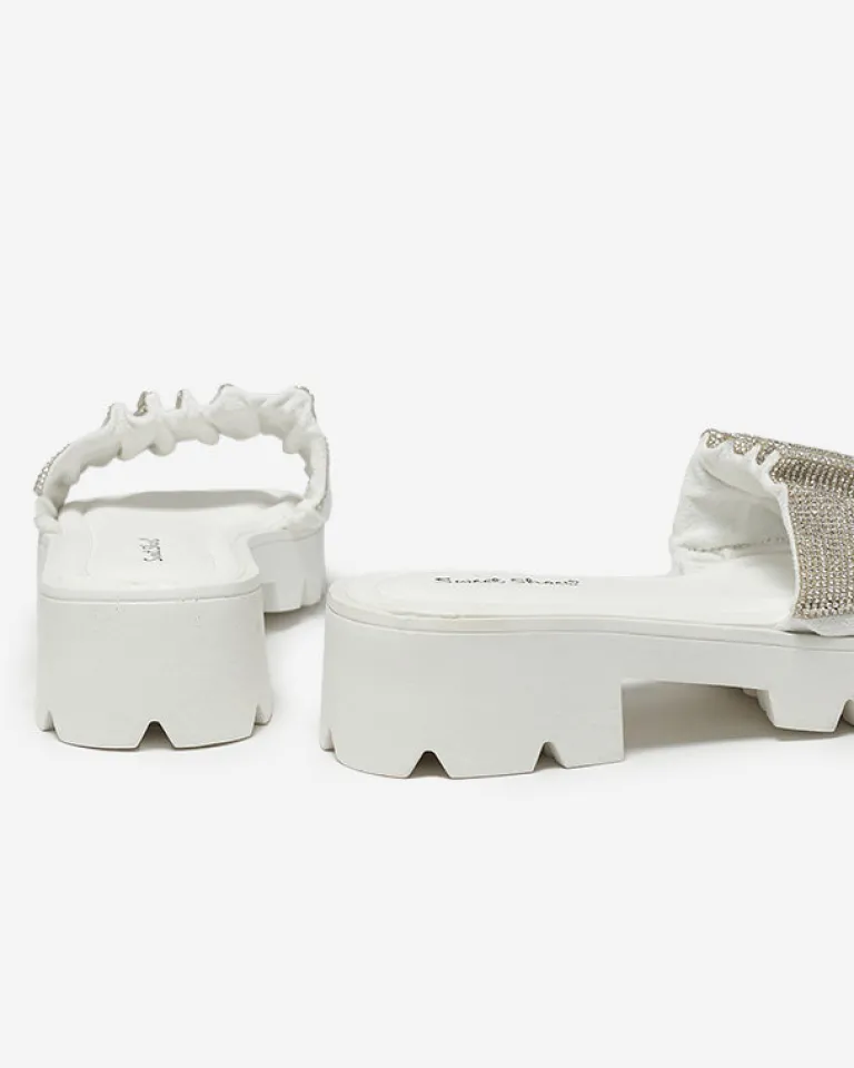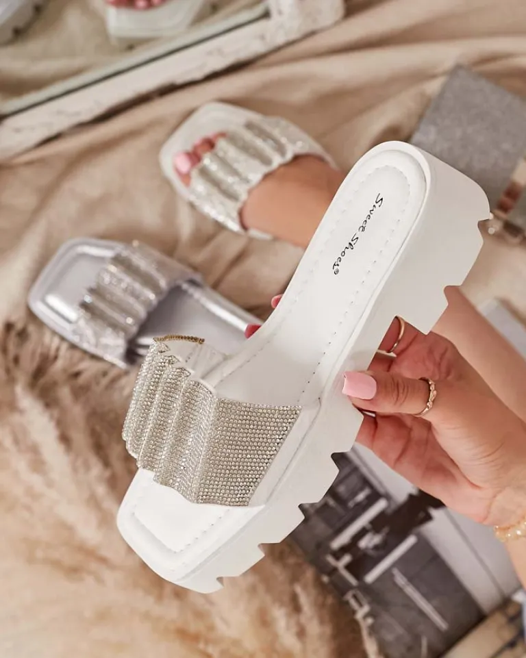 Clearance Białe klapki damskie z cyrkoniami Emkoy Klapki Na Obcasie