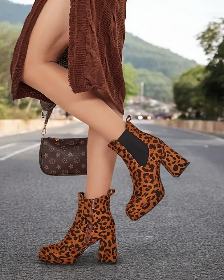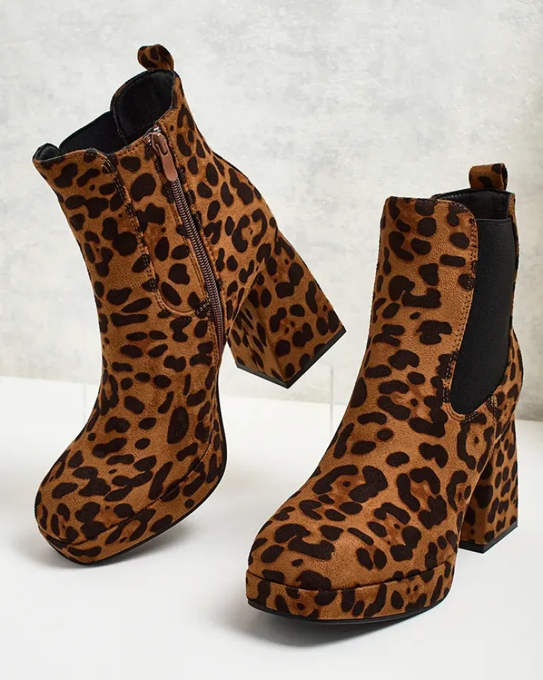 - Botki na słupku- styl i wygoda w jednym. Model zapinany na zamek. Całość wykonana ze skóry ekologicznej zamszowej i eko skórzanej wkładki. Model zdobiony wzorem w panterkę. Ten model doda Ci pewności siebie!