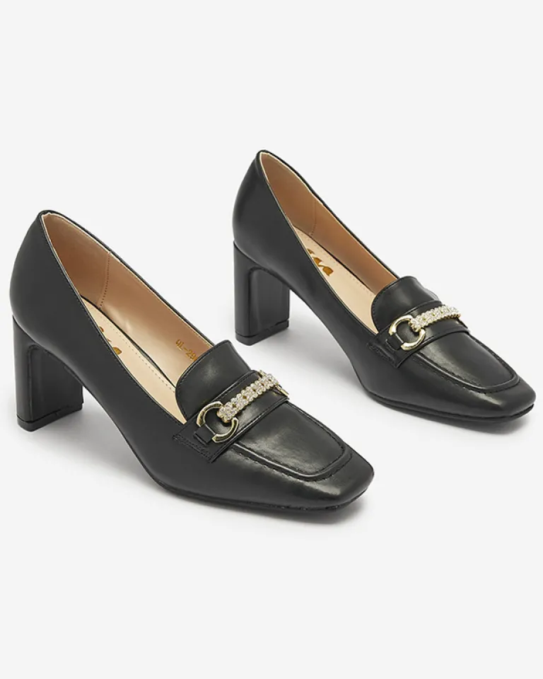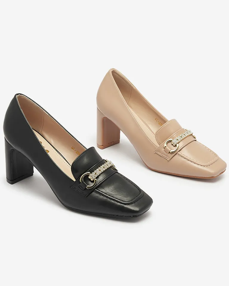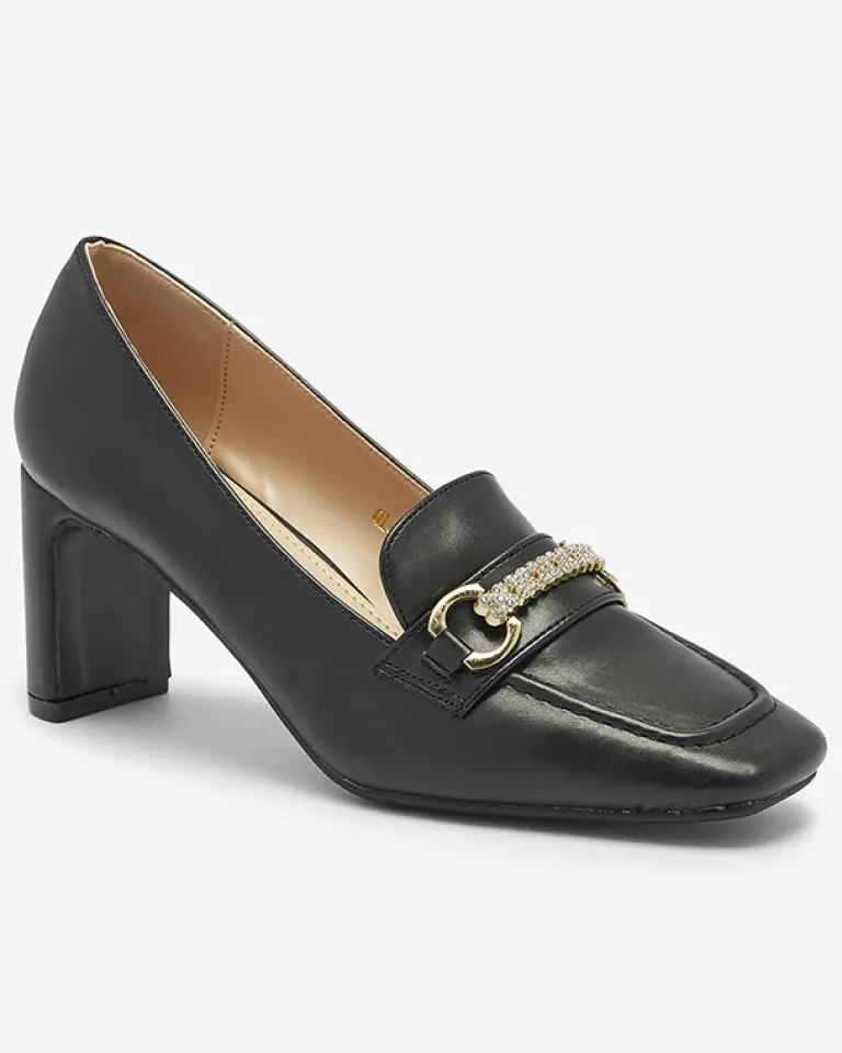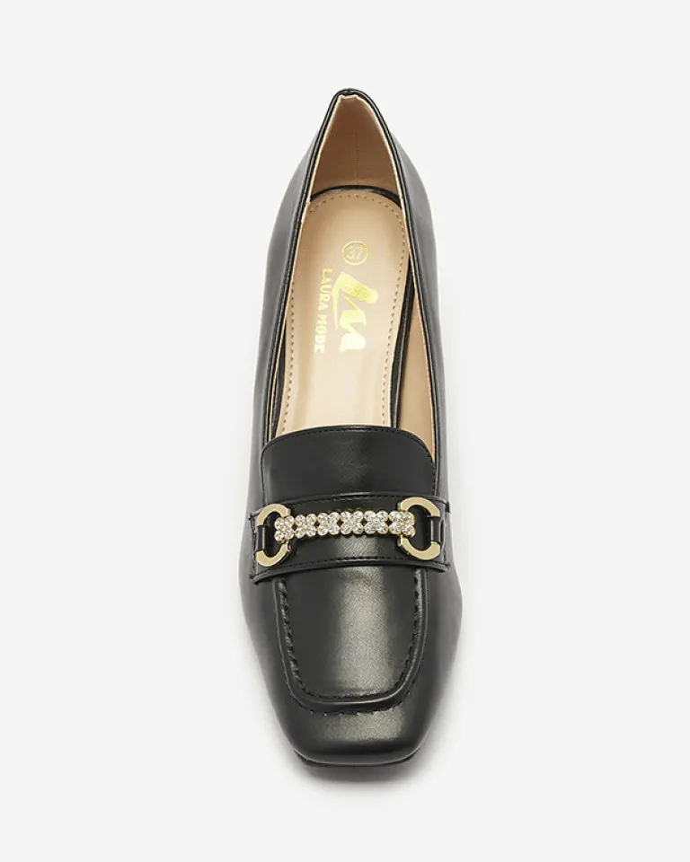 - Oryginalne czółenka damskie w stylu mokasyn. Model wykonany w całości ze skóry ekologicznej. Nosek kwadratowy z ozdobą z cyrkoniami dodaje im uroku. Wygodny model, na słupku. Idealne do wiosennych outiftów!