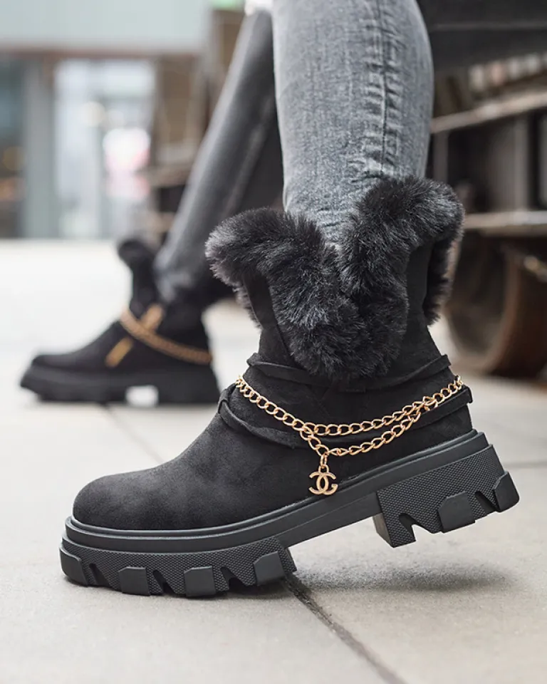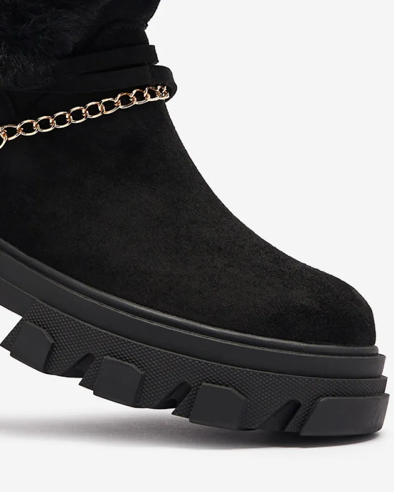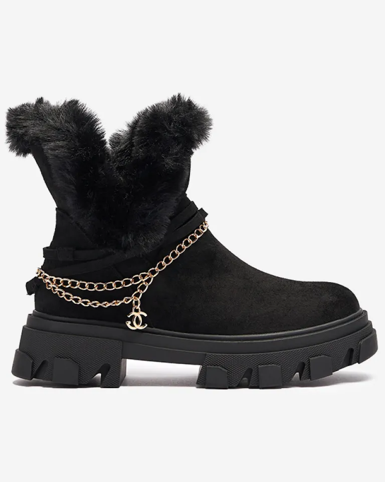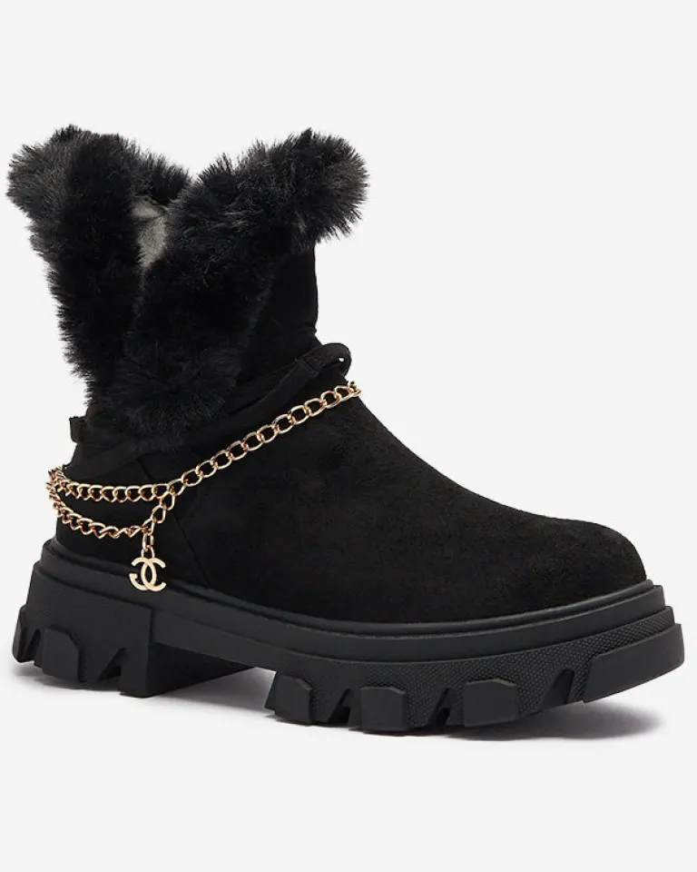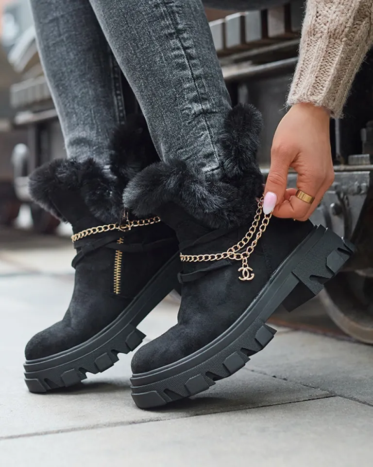 - Ponadczasowe damskie botki na płaskim obcasie, zdobione łańcuszkiem w złotym kolorze. Para jest wykonana ze skóry ekologicznej zamszowej, środek jest częściowo ocieplany delikatnym futerkiem. Po boku zapięcie suwakiem. CZARNE OCIEPLANE BOTKI VIDERIC