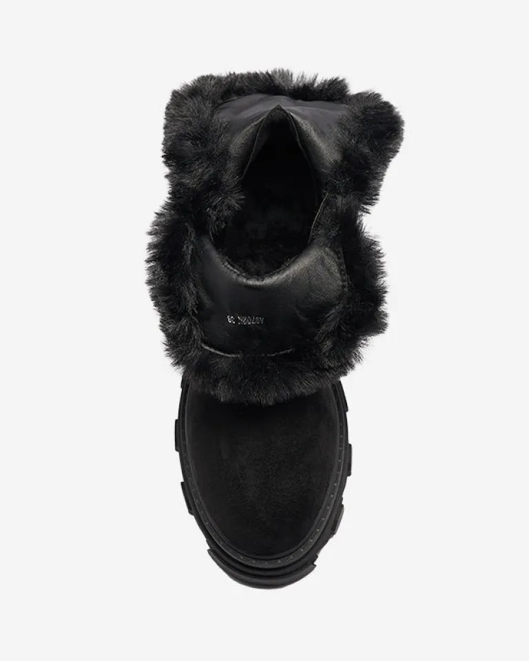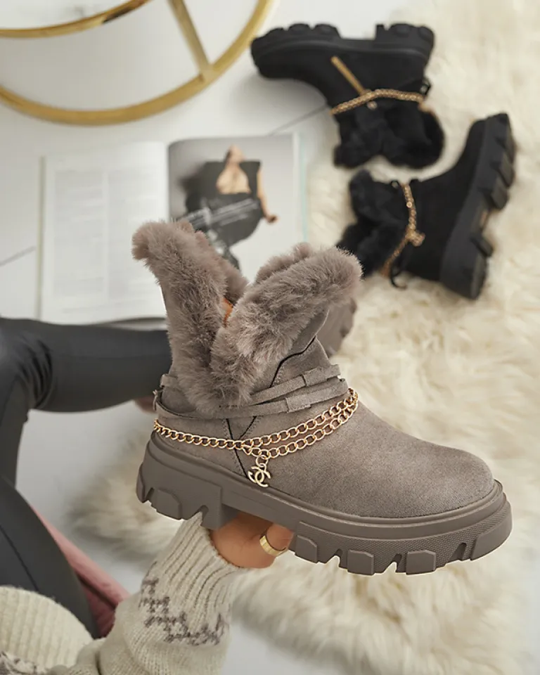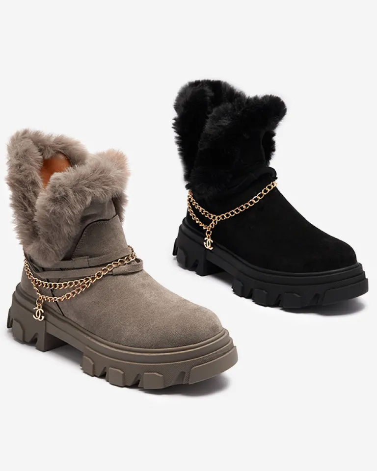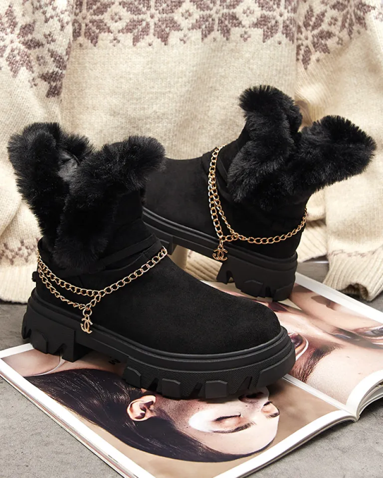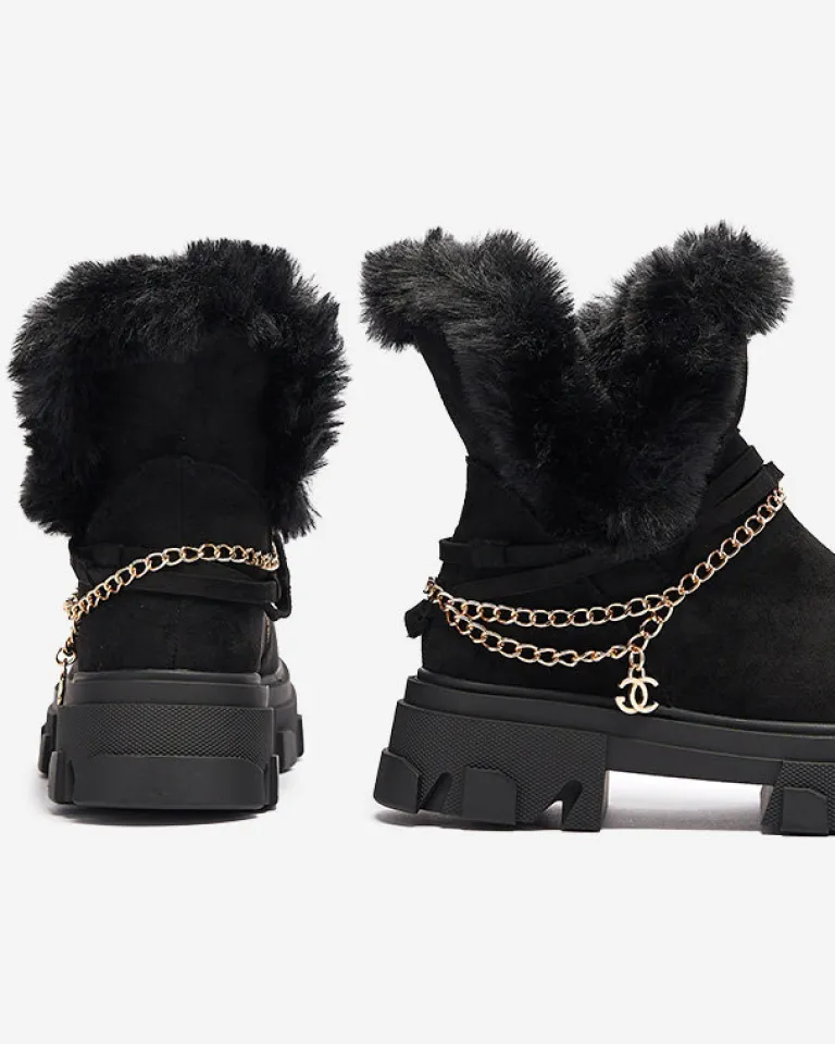 - Ponadczasowe damskie botki na płaskim obcasie, zdobione łańcuszkiem w złotym kolorze. Para jest wykonana ze skóry ekologicznej zamszowej, środek jest częściowo ocieplany delikatnym futerkiem. Po boku zapięcie suwakiem. CZARNE OCIEPLANE BOTKI VIDERIC