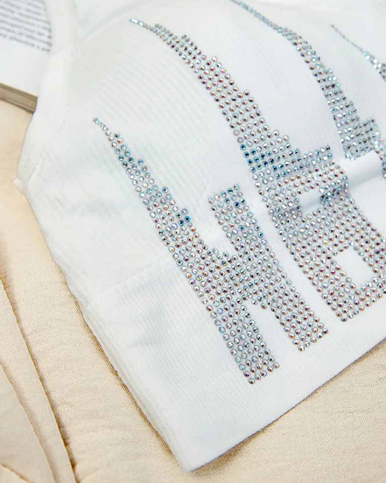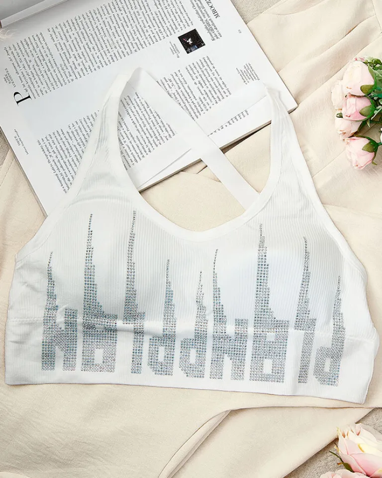 - Sportowy damski biustonosz wykonany z elastycznego, przyjemnego materiału. Model z nieregulowanymi, krzyżowanymi ramiączkami, bez zapięcia i z wyjmowanymi wkładkami, wykończony na dole szeroką gumą i zdobiony cyrkoniami. Idealnie dopasuje się do ciała.