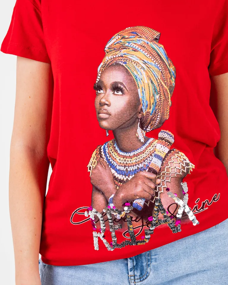 - Oryginalny t-shirt damski z okrągłym dekoltem i krótkim rękawem. Przednia część koszulki jest zdobiona kolorowym nadrukiem i cekinami. Będzie świetną ozdobą do codziennych stylizacji. UWAGA: Dokładność pomiaru (+/-) 1 cm.