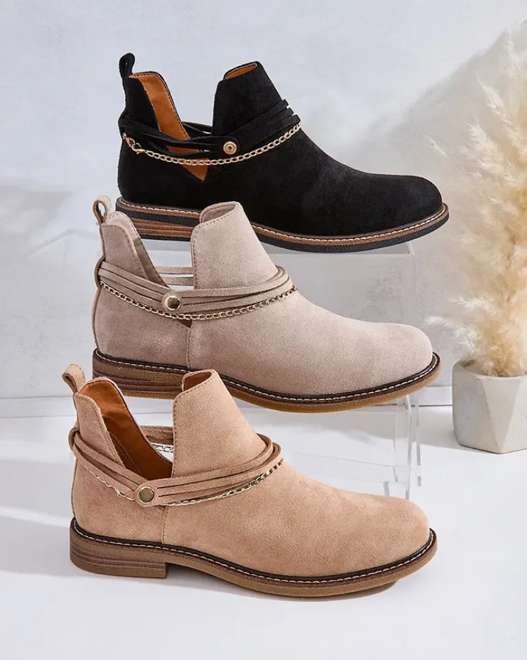 - Stylowe damskie eko zamszowe botki z wkładką ze skóry naturalnej to idealne rozwiązanie na chłodniejsze dni. Model wsuwany z ozdobnymi łańcuszkami na cholewce. Obuwie na płaskim obcasie i z okrągłym noskiem. Super dodatek do Twoich casualowych outfitów!