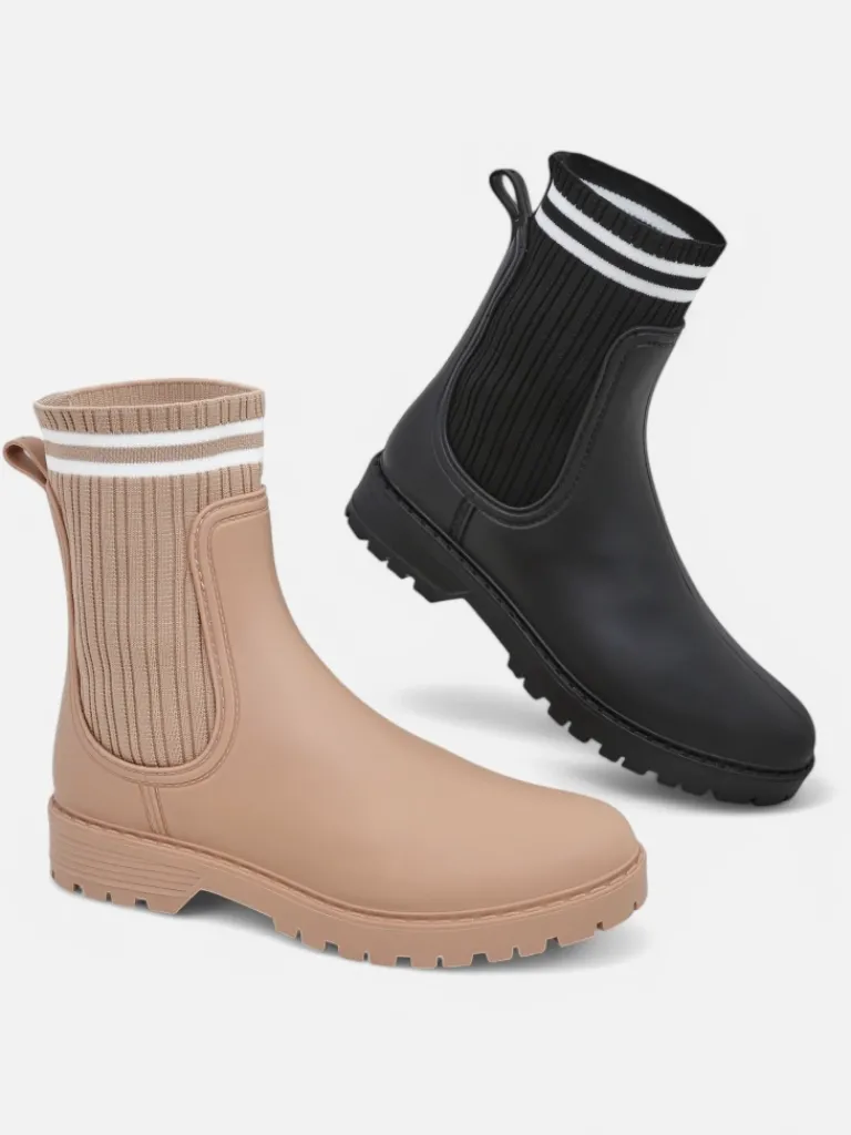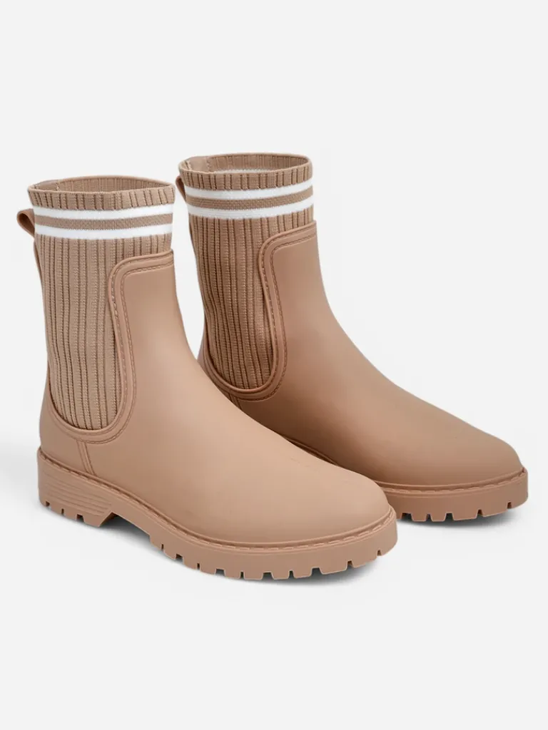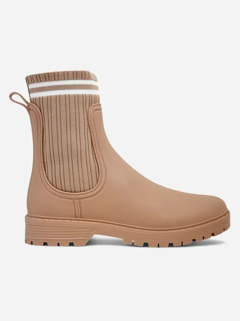 - Klasyczne damskie kalosze na płaskim obcasie, wykonane z materiału gumowego oraz wyższej, tkaninowej wstawki a 'la skarpetka. W środku wkładka z tkaniny. Idealne na wiosenne deszczowe dni!