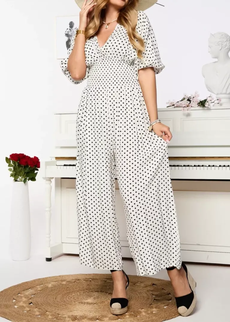 - Przepiękny kombinezon damski w groszki, z krótkimi rękawami. Model z kopertowym dekoltem, wiązaniem z tyłu oraz szeroką gumą w talii. Produkt posiada szerokie, długie nogawki. UWAGA: Dokładność pomiaru (+/-) 1 cm.