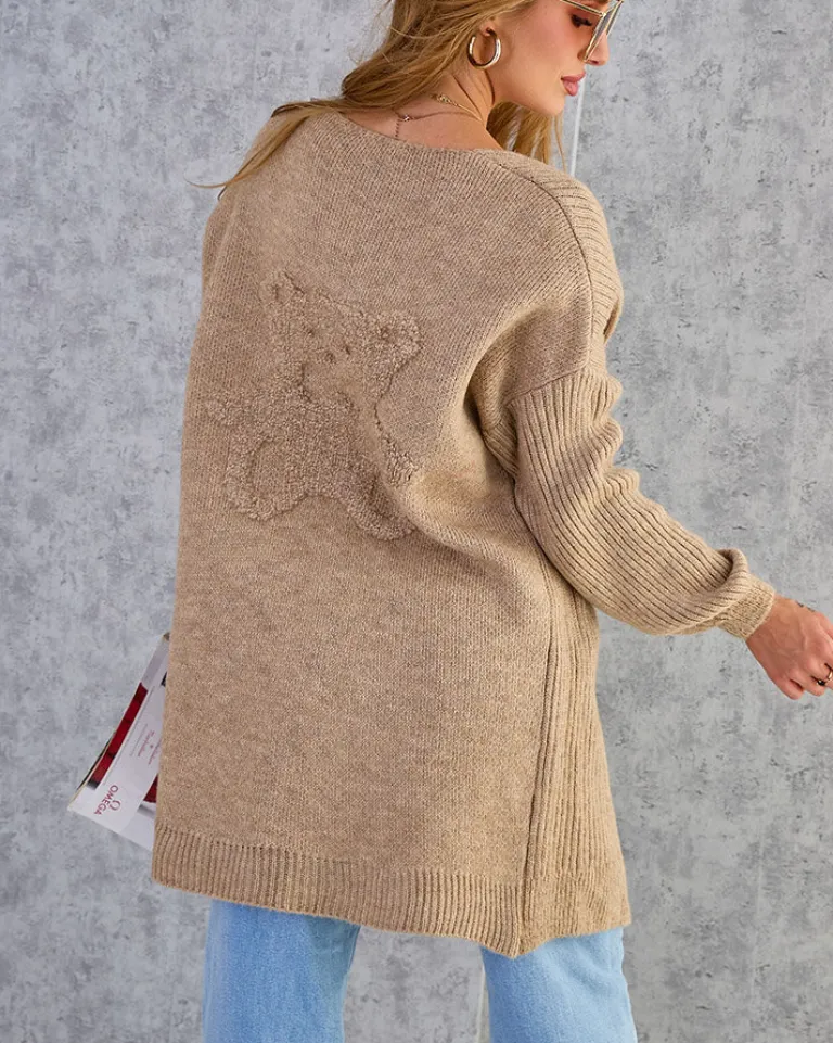 - Przepiękny damski sweter typu narzutka, wykonany z przyjemnego materiału dzianinowego. Na plecach ozdobny miś. Must have Twojej garderoby dopełniający jesienne stylizacje! UWAGA: Dokładność pomiaru (+/-) 1 cm.