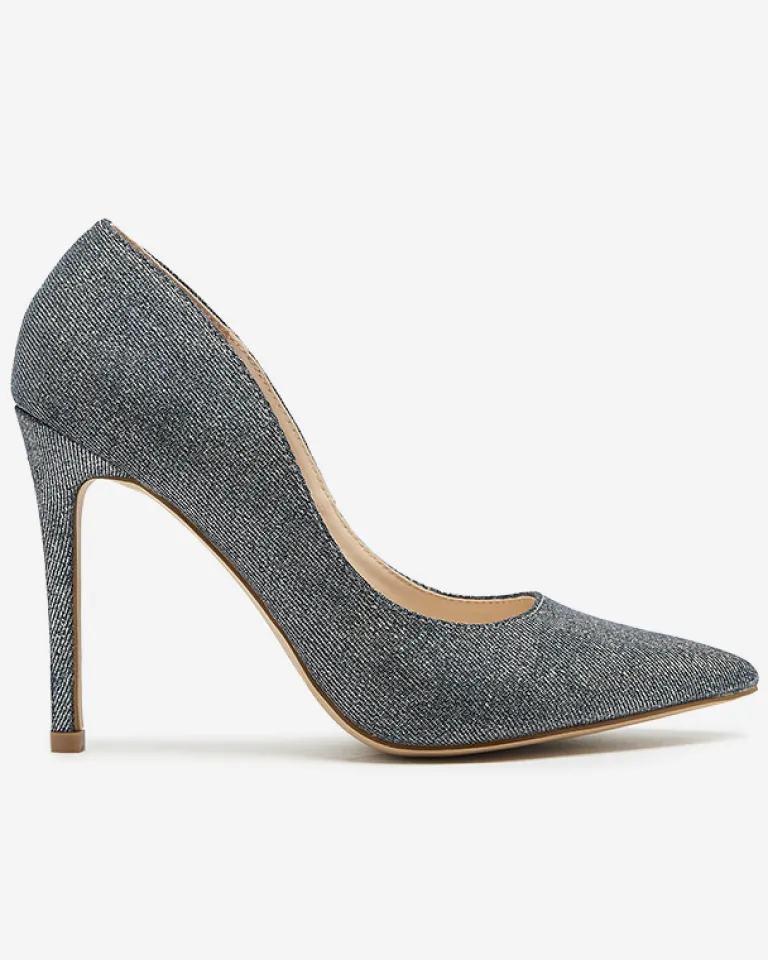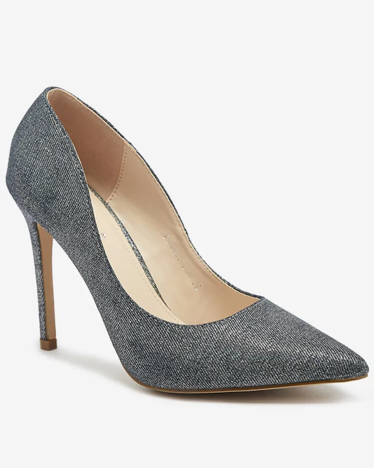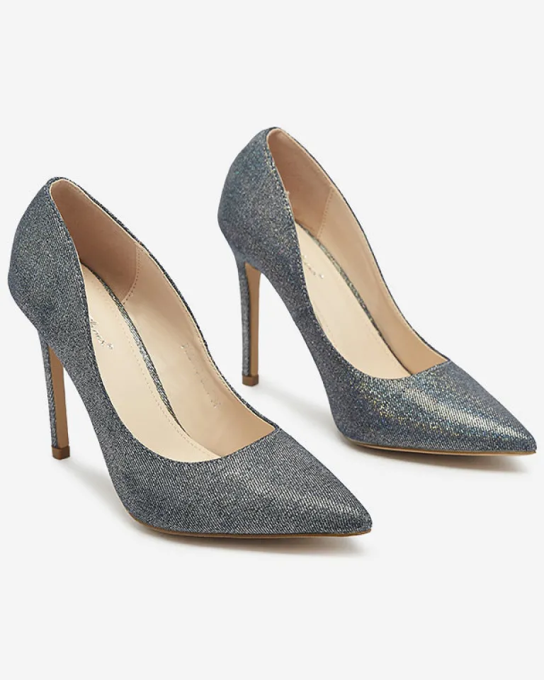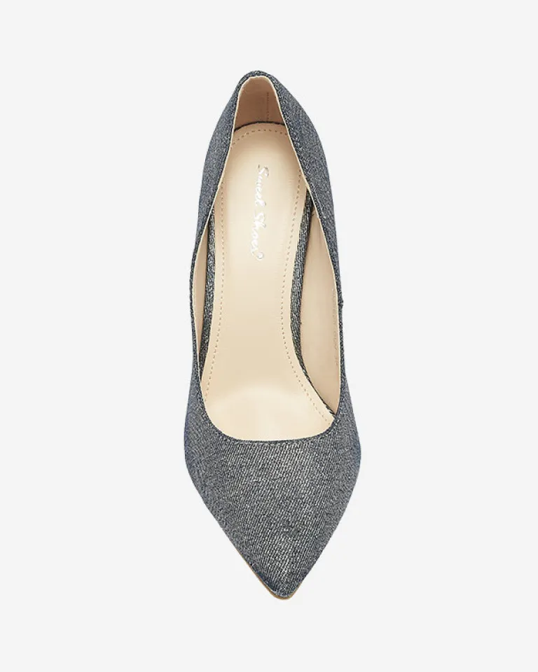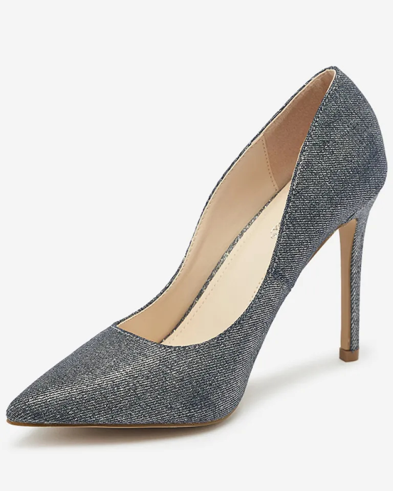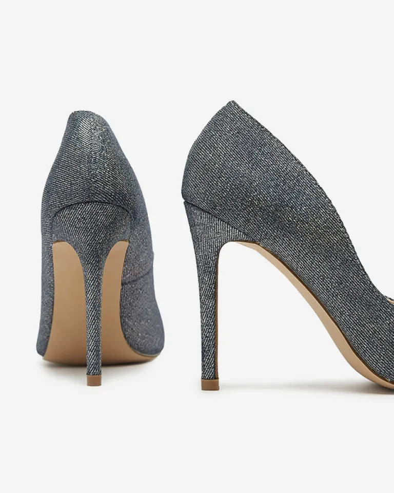 - Eleganckie damskie czółenka na szpilce, pokryte holograficzną tkaniną. Posiadają wkładkę ze skóry ekologicznej. Model wykończony noskiem w szpic. Świetnie sprawdzą się do sukienki!