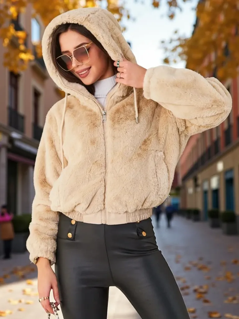 - Wyjątkowa kurtka damska wykonana z przyjemnego, miękkiego materiału a’la futerko. Model posiada kaptur, 2 kieszenie oraz jest zapinany na suwak. Hit tego sezonu!