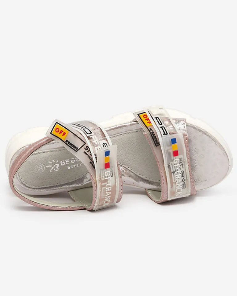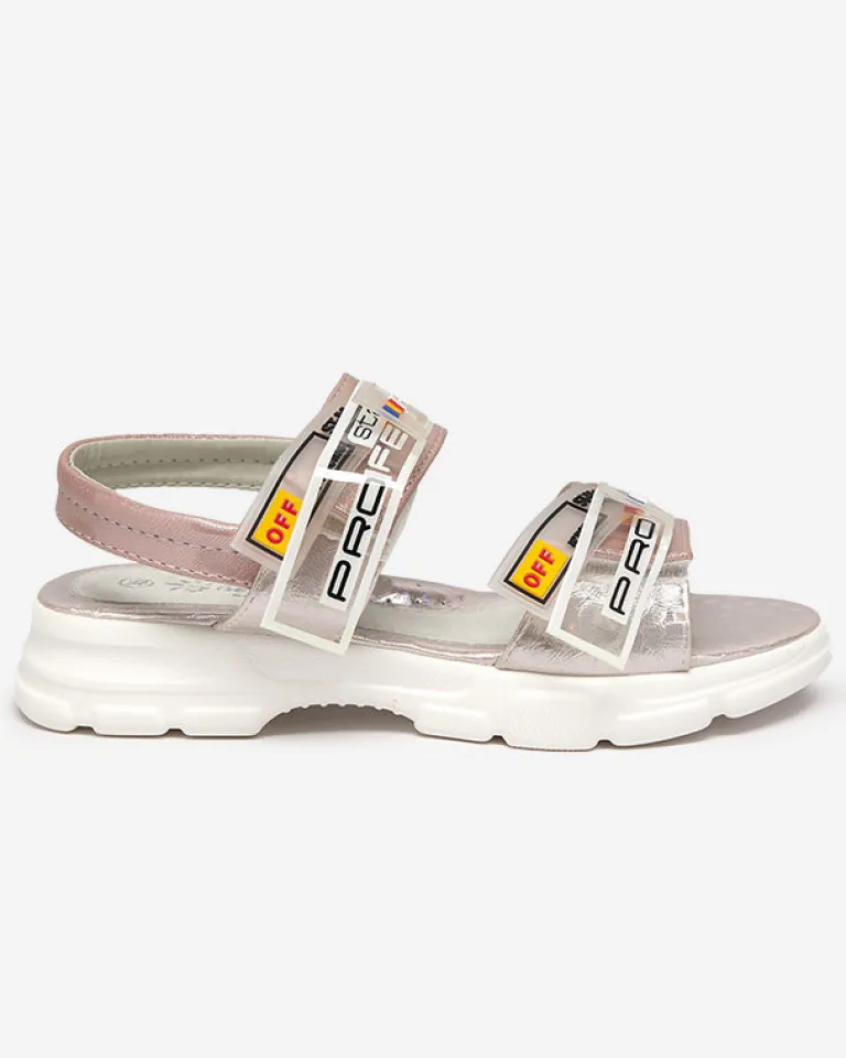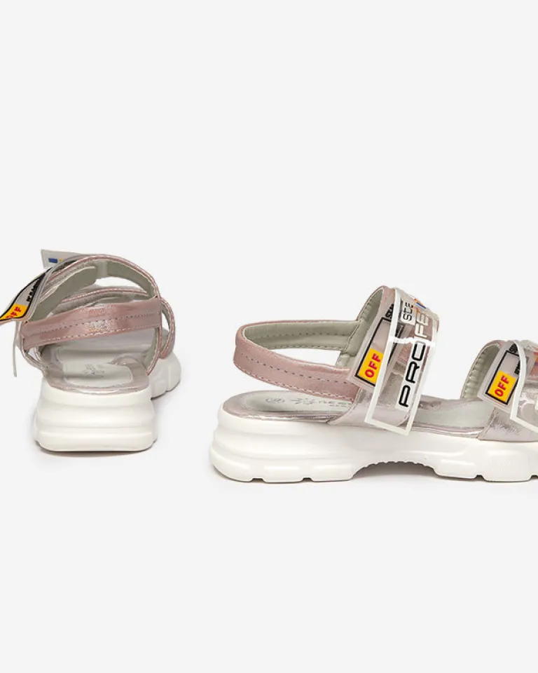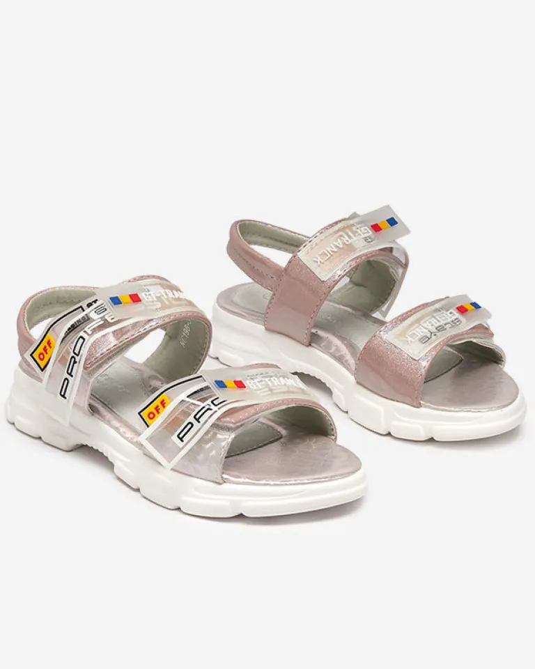 - Klasyczne dziewczęce sandałki wykonane ze skóry ekologicznej z holograficznym wykończeniem. Wkładka jest wyłożona połączeniem eko-skóry oraz skóry ekologicznej nubuk. Szerokość obuwia można regulować za pomocą rzep. Doskonale sprawdzą się na co dzień!