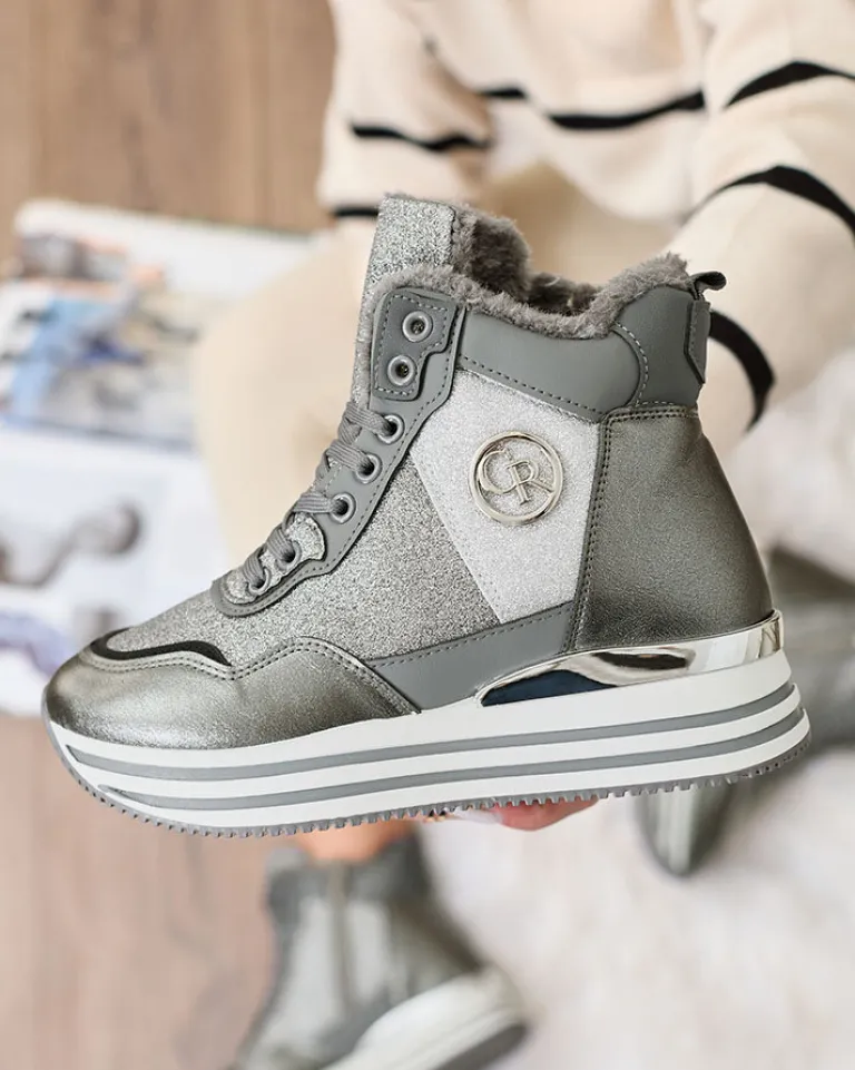 - Sportowe sneakersy damskie na grubszej platformie. Cholewka zapinana na suwak i sznurowana, wykonana z połączenia eko skóry i tkaniny z brokatem. Wnętrze w całości ocieplone futerkiem. Idealne do zimowych outfitów!