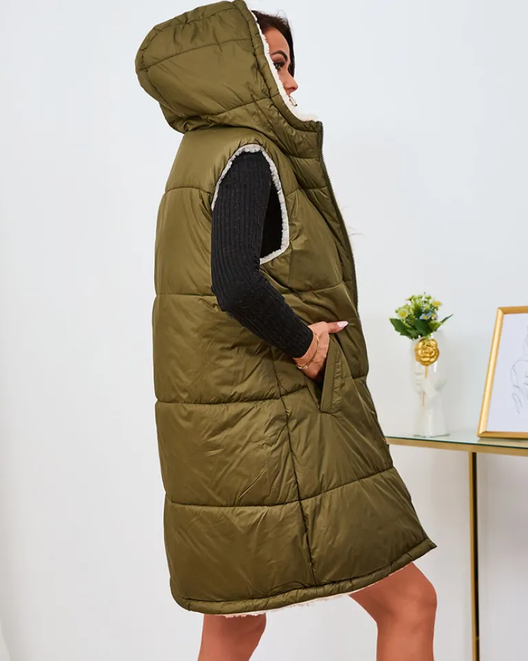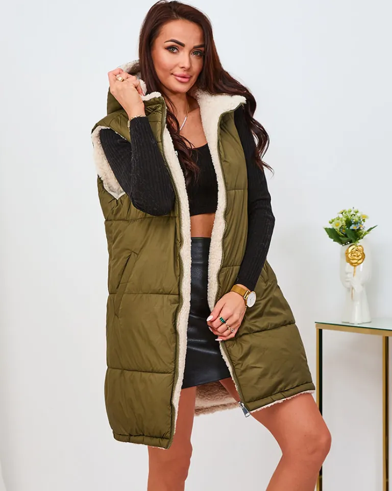 - Super stylowa długa dwustronna kamizelka damska z pikowanym wykończeniem i kożuszkiem- idealna na jesienną porę. Bezrękawnik zapinany suwakiem, posiada kaptur, cztery wsuwane kieszenie. Model w stylu casual!