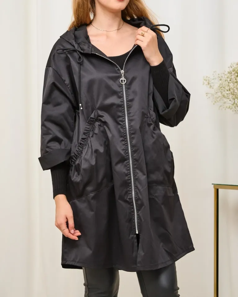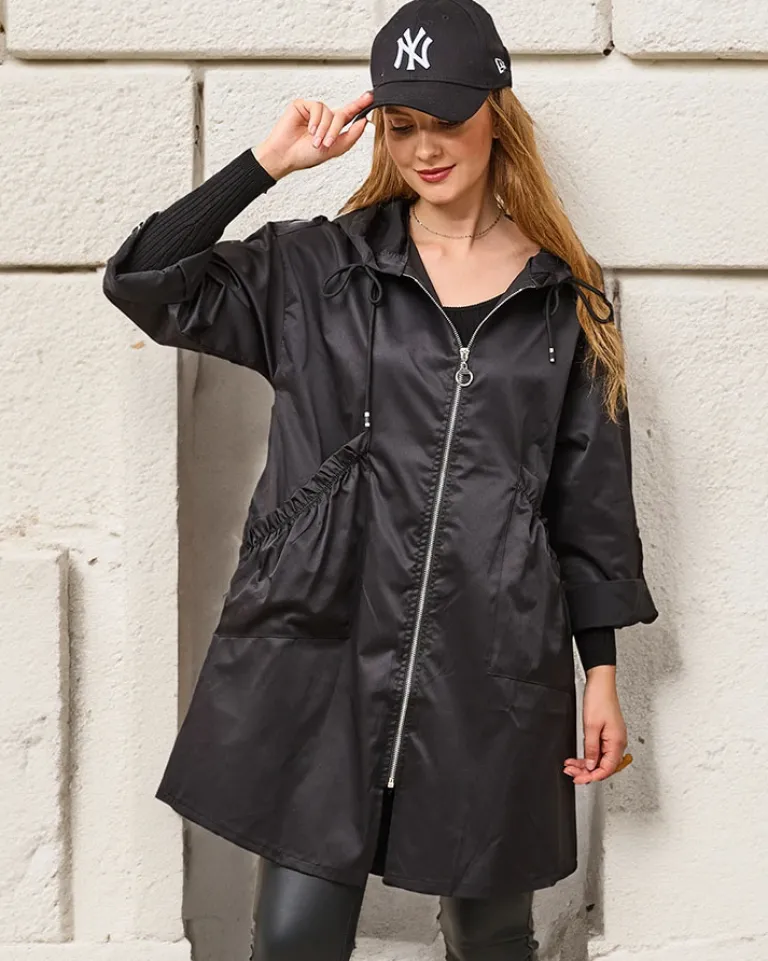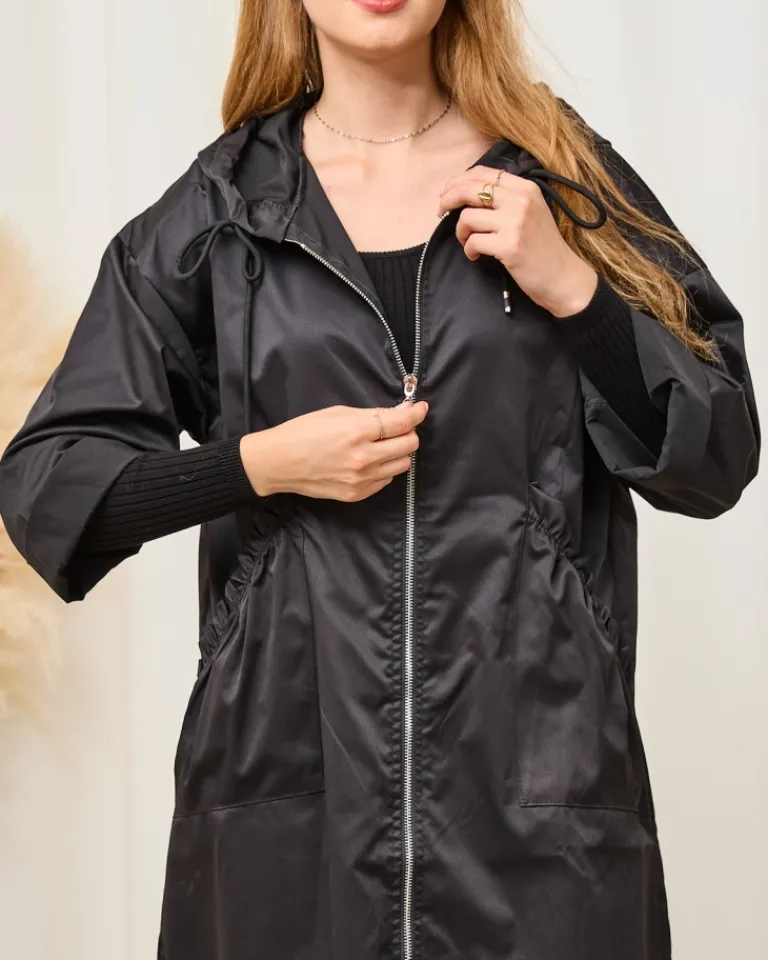 - Stylowa damska kurtka – płaszcz z kapturem, wykonana z przyjemnej tkaniny. Model o luźnym kroju, posiada długie rękawy i zapięcie na zamek. Po bokach naszyte dwie wsuwane kieszenie. Świetna na jesienną pogodę! UWAGA: Dokładność pomiaru (+/-) 1 cm.