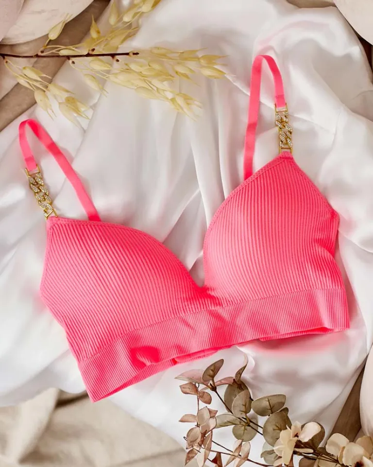 - Klasyczny damski biustonosz wykonany z elastycznego, przyjemnego materiału. Model z ozdobnymi, cienkimi ramiączkami i z niewyjmowanymi wkładkami, wykończony na dole gumą. Idealnie dopasuje się do ciała.