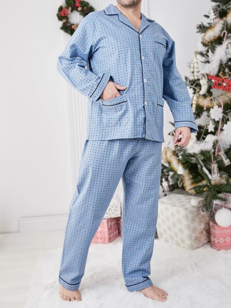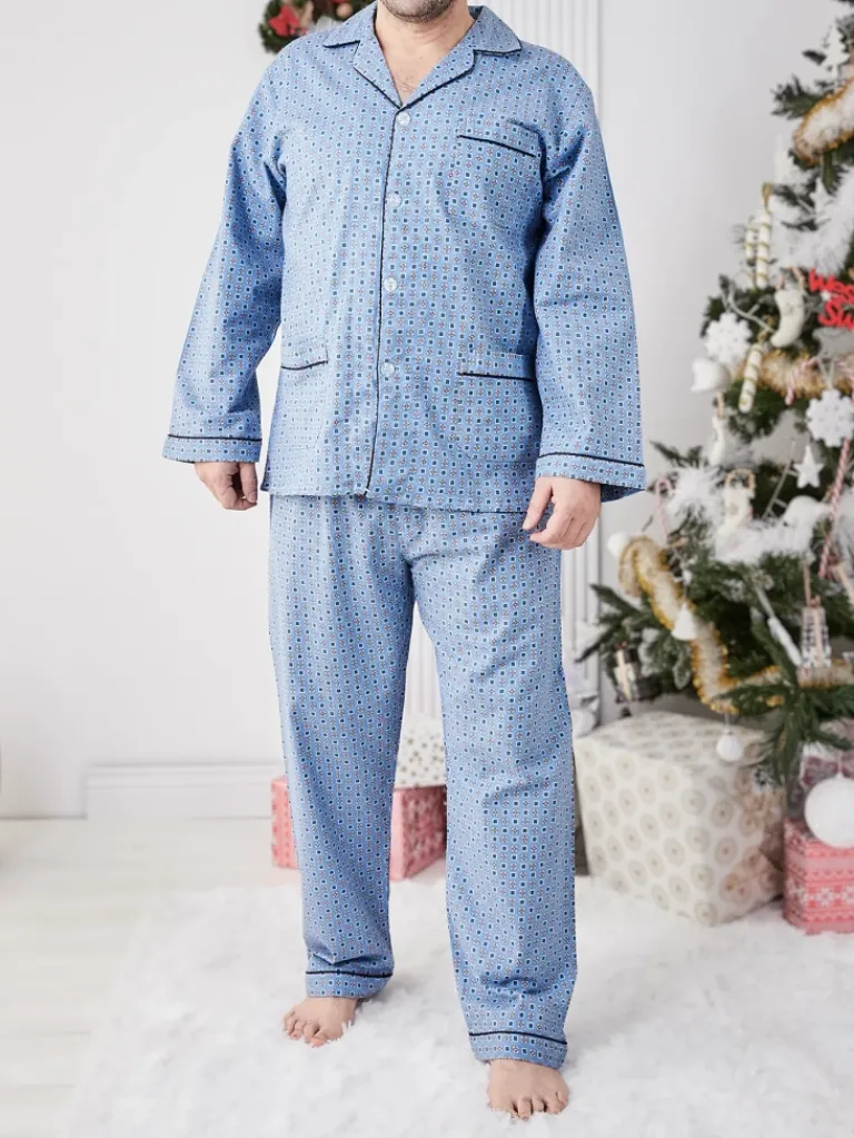 - Piżama męska z modnym printem, wykonana z materiału bawełnianego. Model posiada długie rękawy oraz nogawki. Góra zapinana na guziki. Komfort i elegancja w jednym!