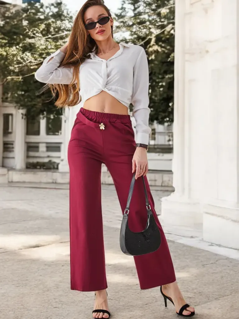 - Rewelacyjne szerokie spodnie wykonane z lekkiej tkaniny, model posiada 2 kieszenie, gumę w pasie. Dodatkowo zdobienie a’la pasek. Must have w Twojej szafie! UWAGA: Dokładność pomiaru (+/-) 1 cm.