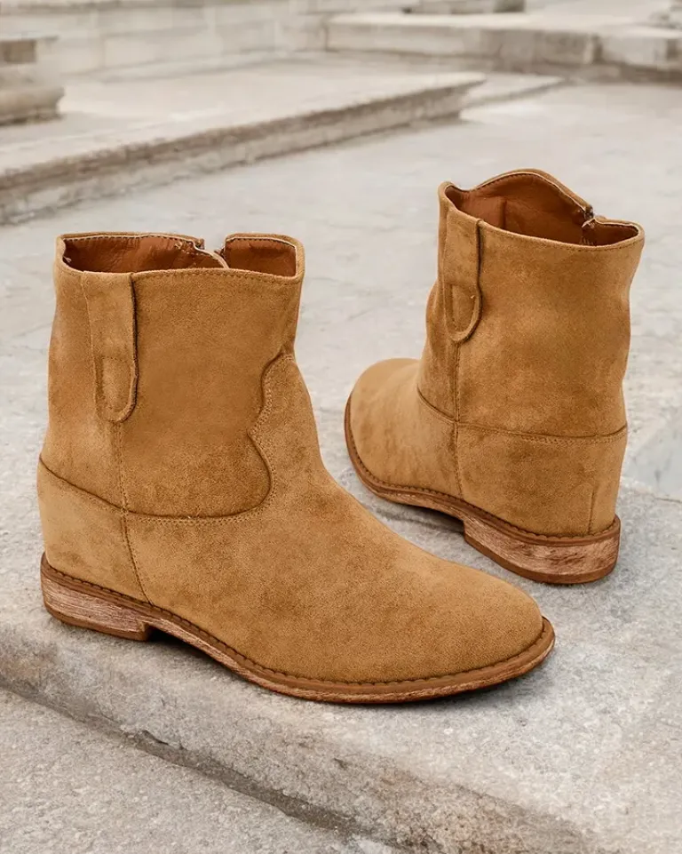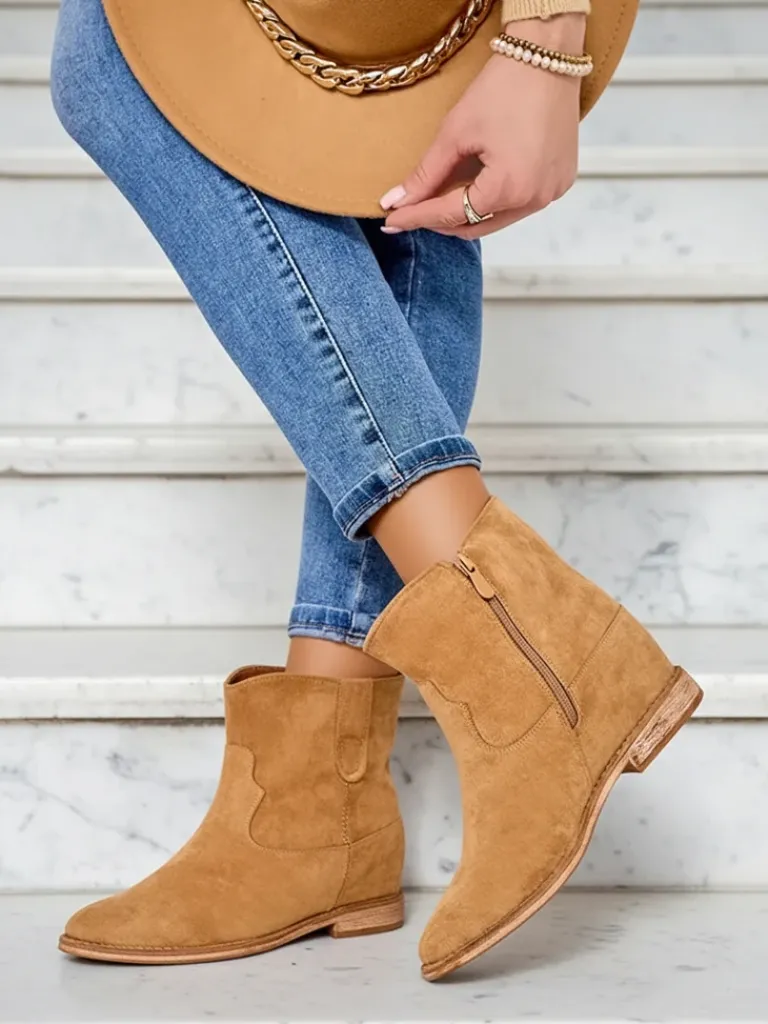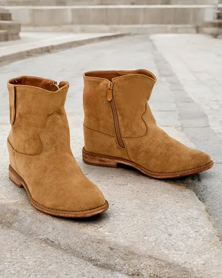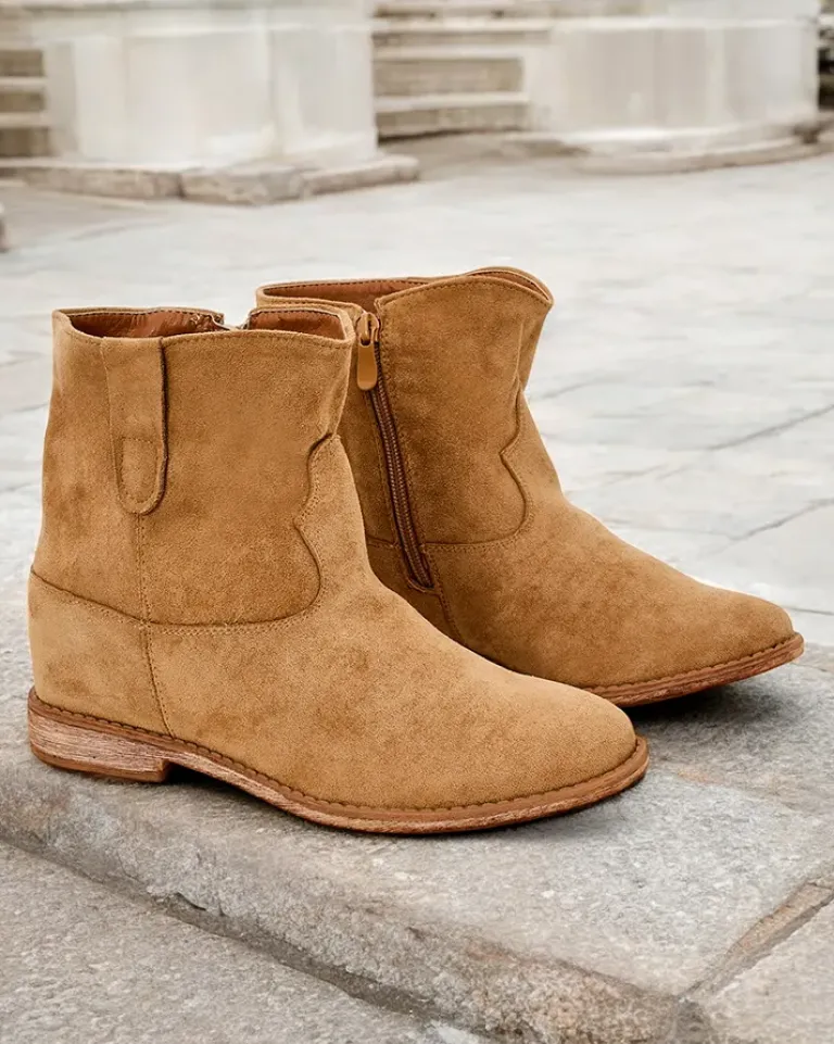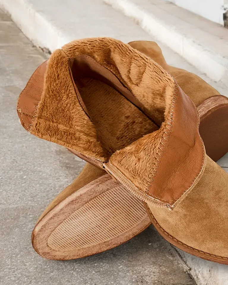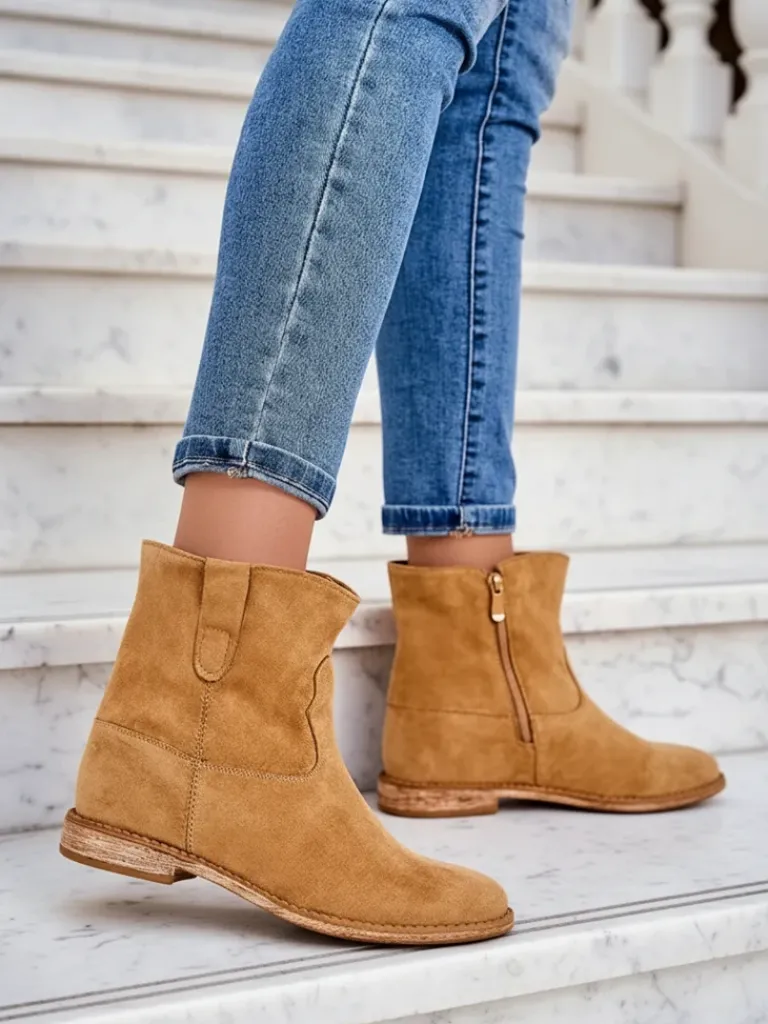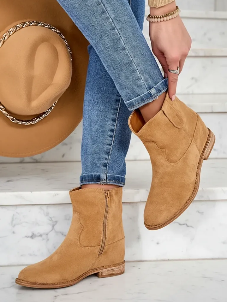 - Beżowe botki a’la kowbojki wykonane ze skóry ekologicznej zamszowej. Model posiada ocieplenie w środku w formie miękkiego futerka. Obuwie na niskiej krytej koturnie. Buty zapinane suwakiem.