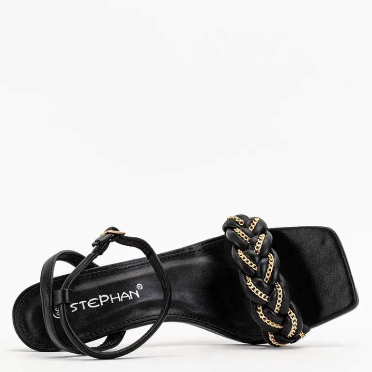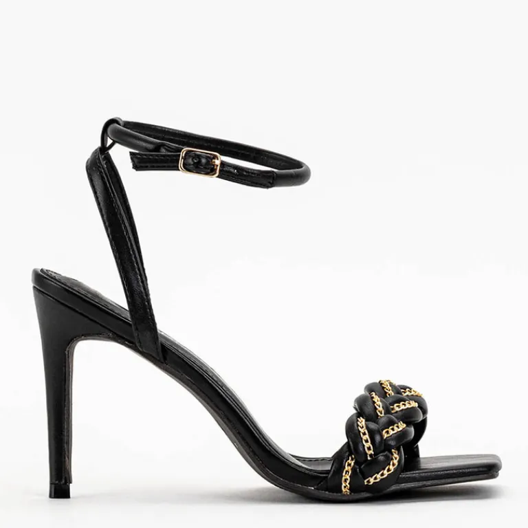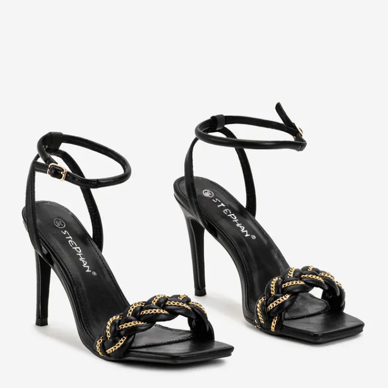 - Przepiękne damskie sandały na szpilce, zdobione złotym łańcuszkiem. Para w całości wykonana ze skóry ekologicznej. Wokół kostki ma regulowany paseczek zapinany na sprzączkę. Świetnie do stworzenia modnych i oryginalnych outfitów!