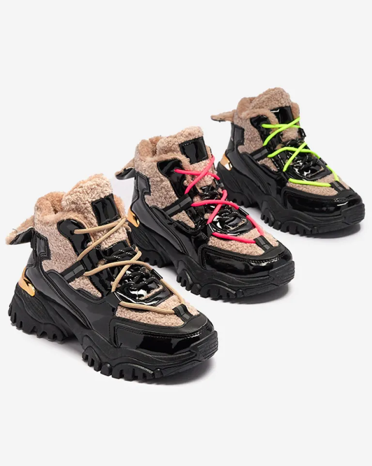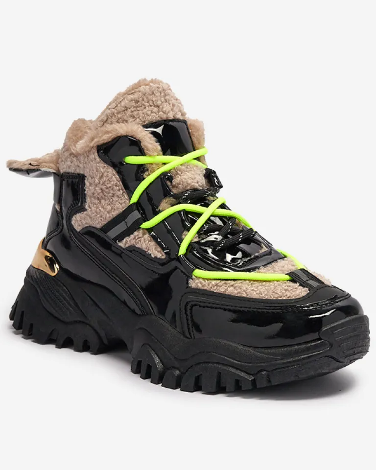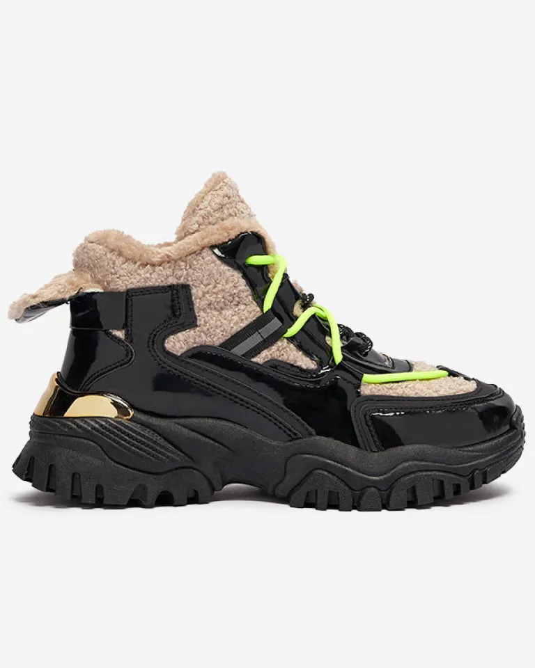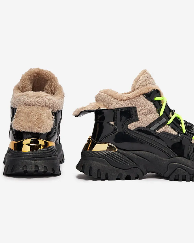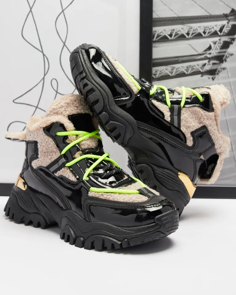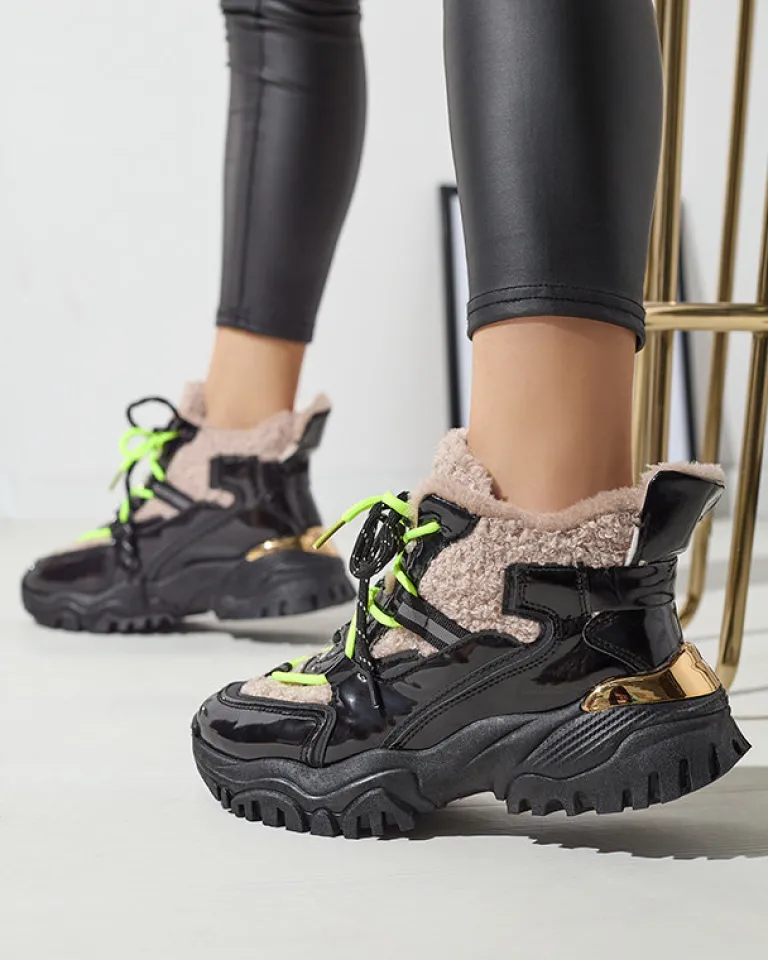 - Sportowe sneakersy damskie na grubej podeszwie, cholewka jest sznurowana i wykonana z połączenia lakierowanej eko skóry oraz tkaniny a’la futerko. Wnętrze w całości ocieplone sztucznym futerkiem. CZARNE SPORTOWE BUTY ZIMOWE DAMSKIE ŚNIEGOWCE ADBO