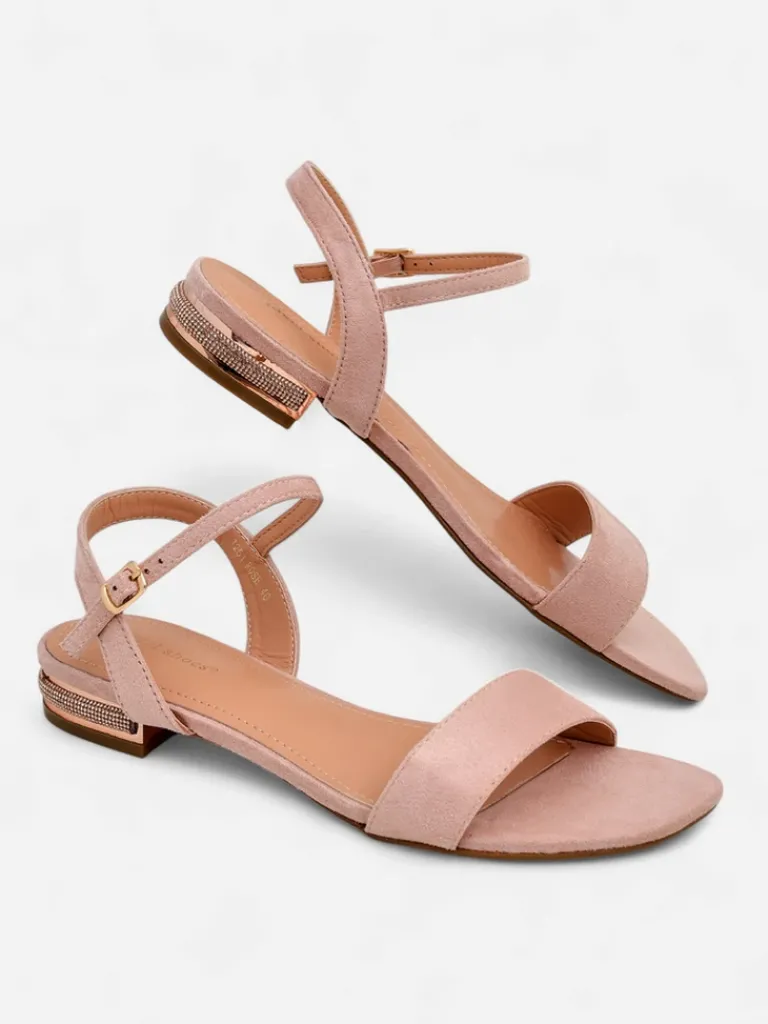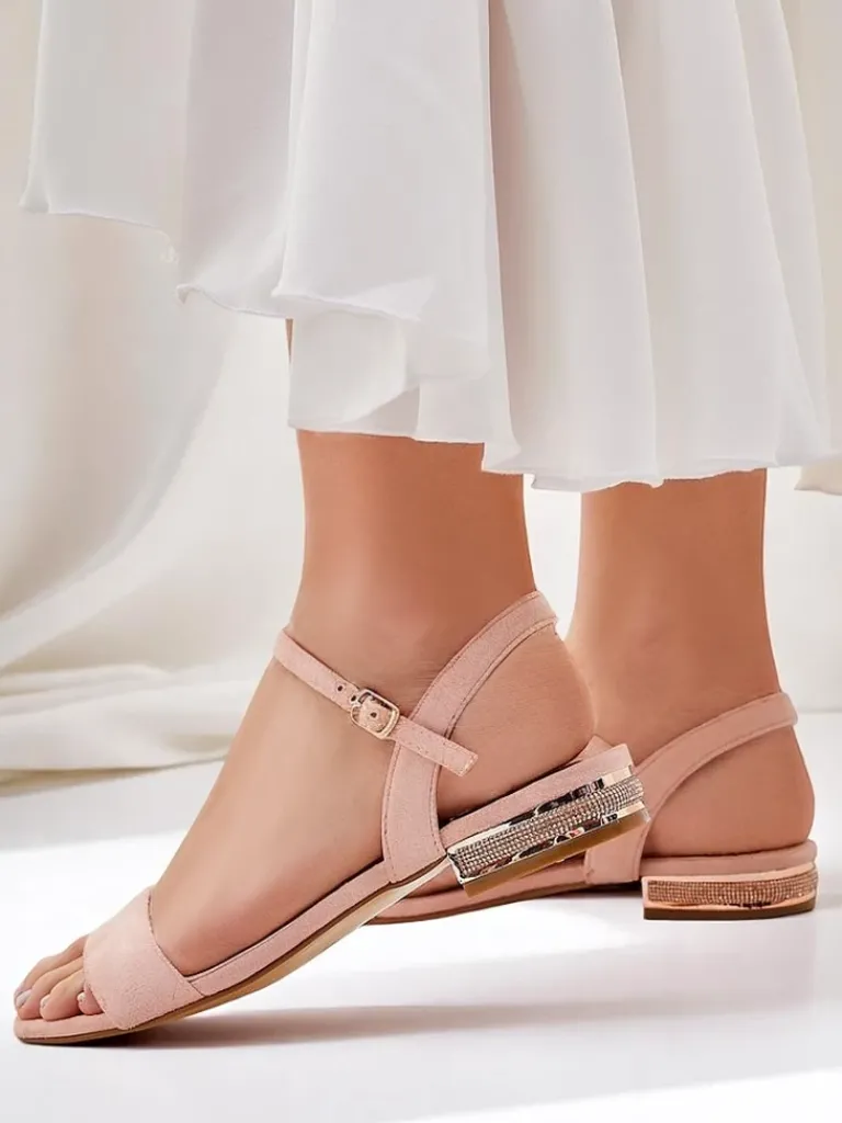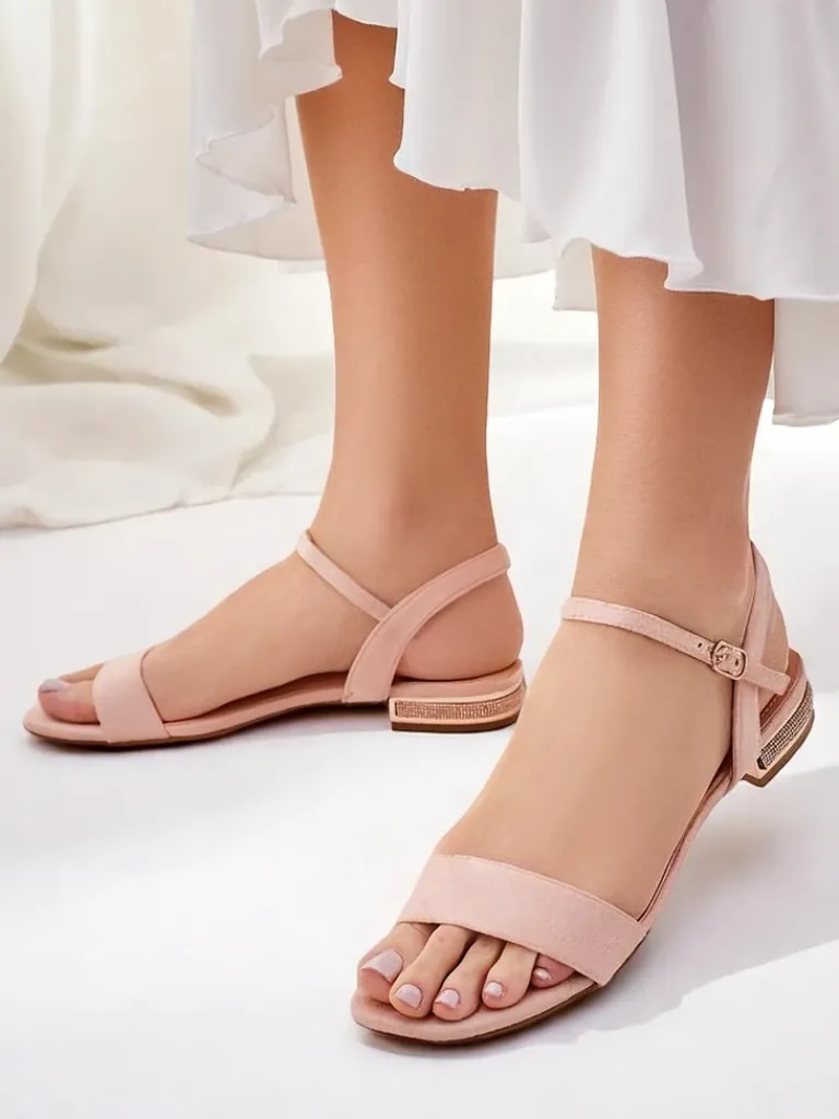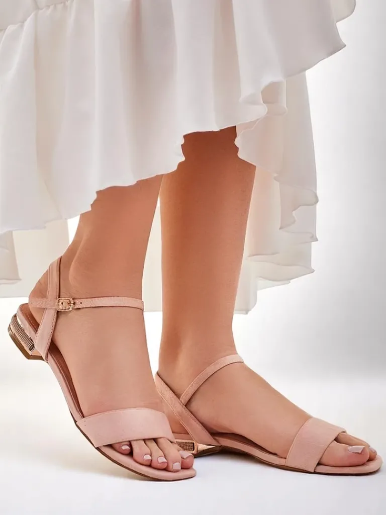 - Damskie sandałki na niskiej podeszwie – to idealny pomysł na gorące letnie dni. Model wykonany z eko skóry zaamszowej i eko skórzanej wkładki. Obuwie zapinane na sprzączkę. Połączenie stylu i wygody!