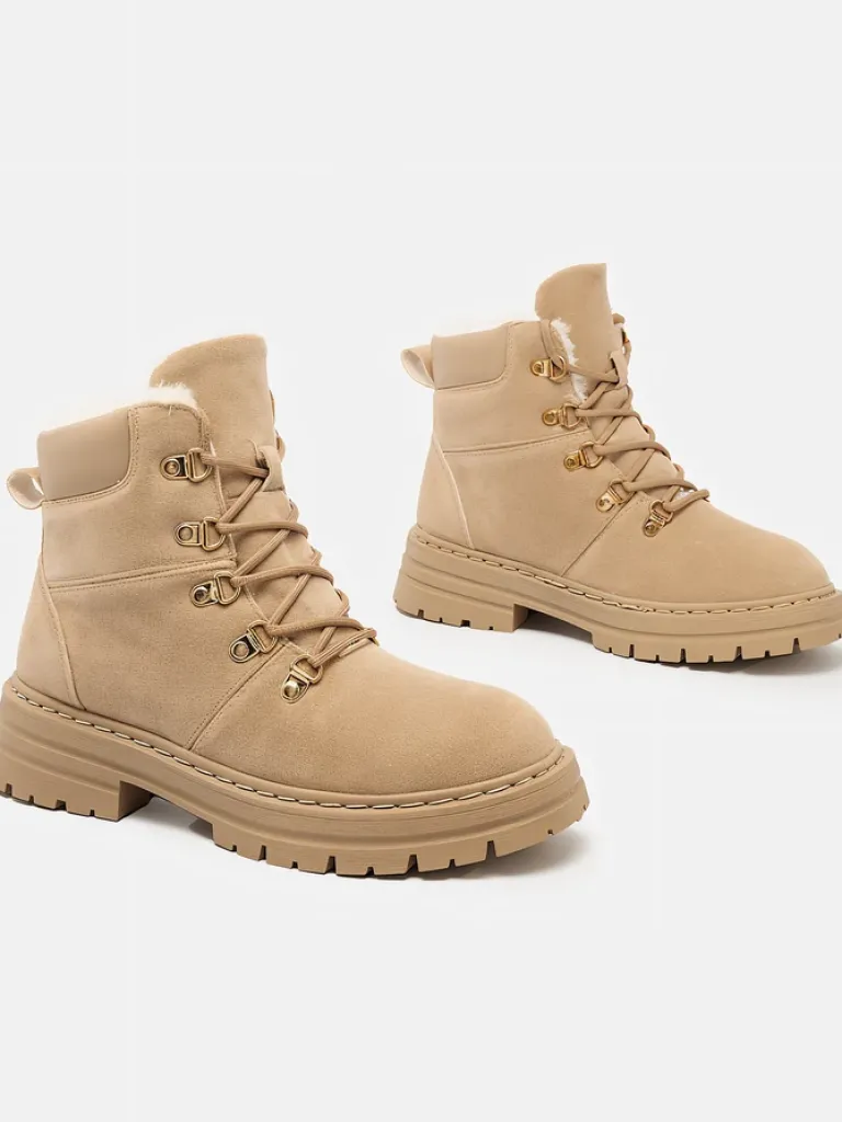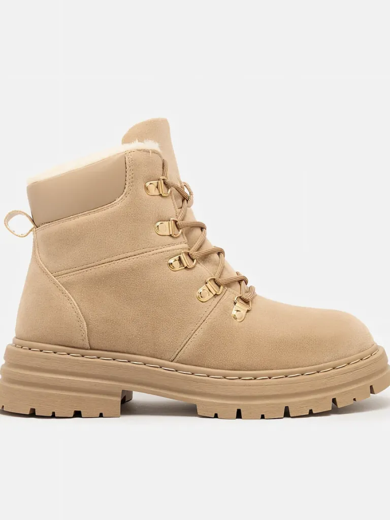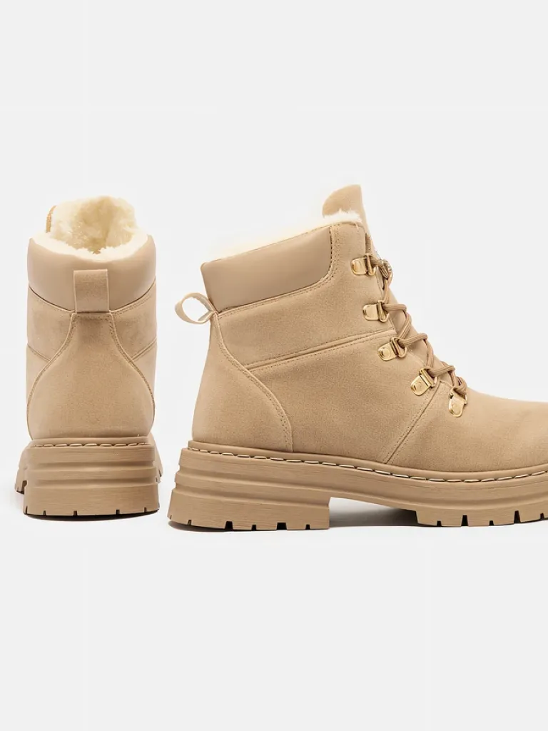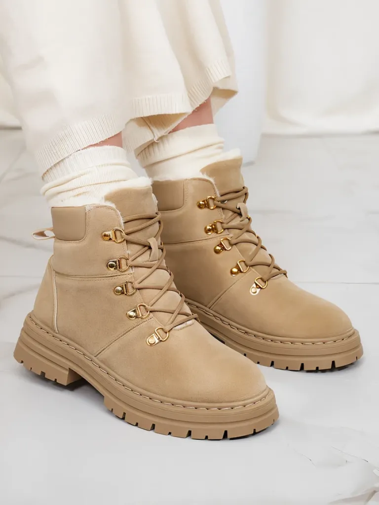 - Ocieplane trapery damskie, wykonane z eko nubuku. Cholewka wiązana, w środku ocieplenie w formie futerka. Konkretne buty na złą pogodę!