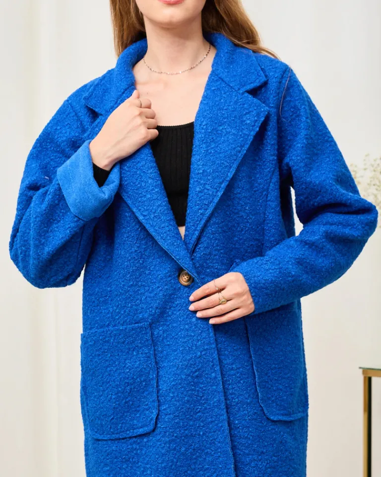 - Stylowy damski płaszcz wykonany z tkaniny a’la kożuszek. Model o luźnym kroju, posiada długie rękawy i zapięcie na guzik. Po bokach naszyte dwie głębokie kieszenie. Świetny na jesień! UWAGA: Dokładność pomiaru (+/-) 1 cm.