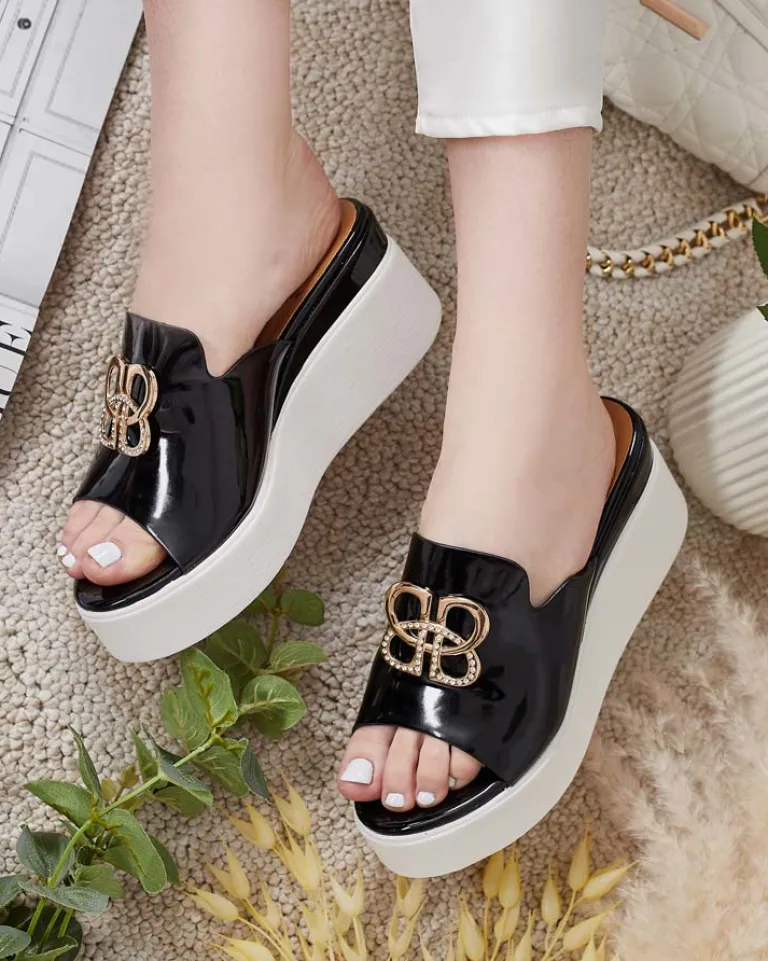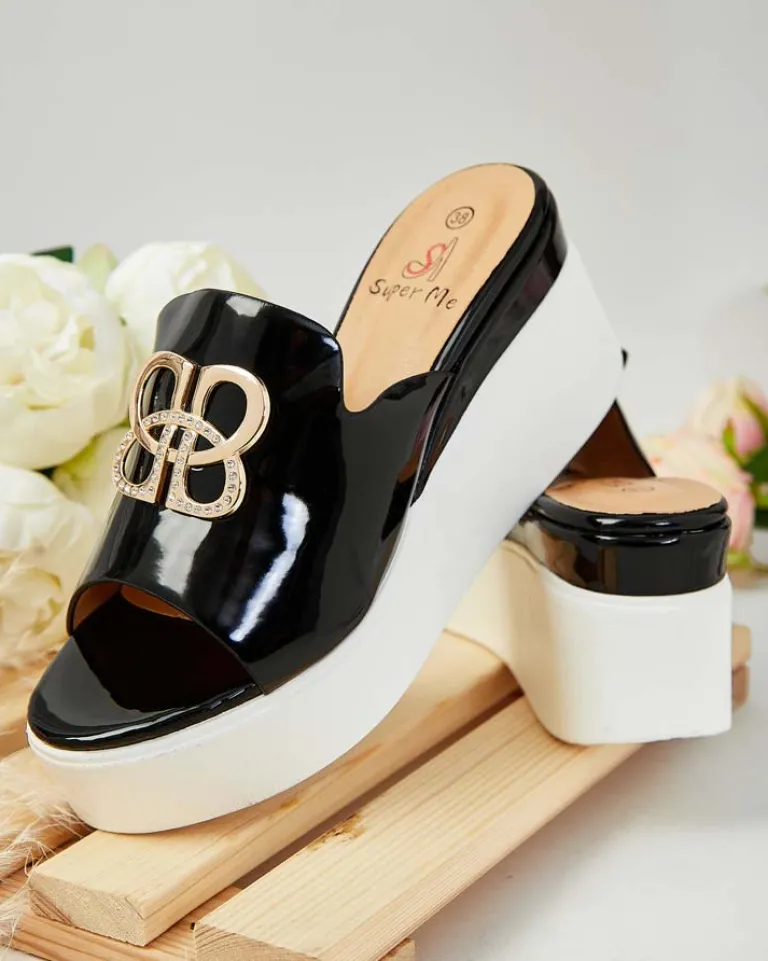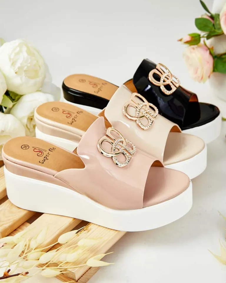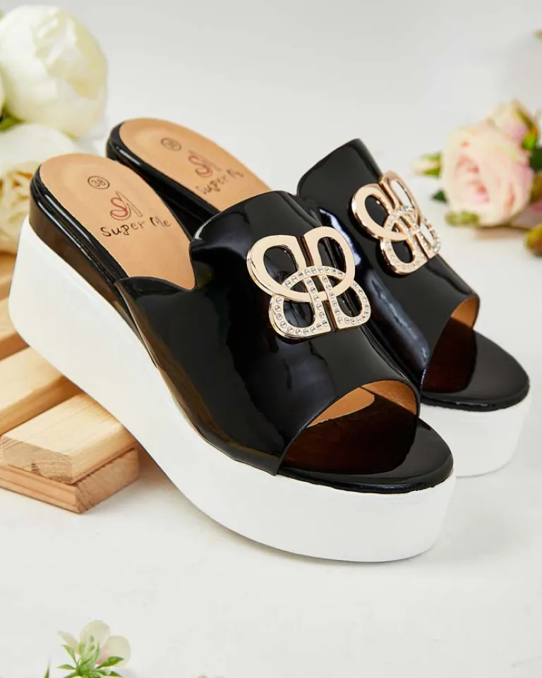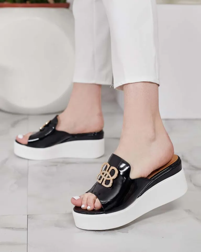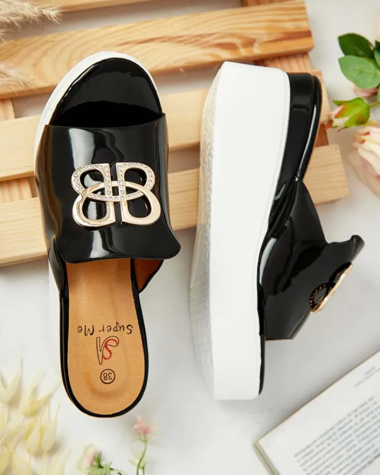 - Klapki damskie z eko skóry lakierowanej i eko skórzanej wkładki. Wysoki koturn i platforma dodaje uroku i charakteru. Ciesz się wygodą i stylem zabierając te obuwie na wakacje!