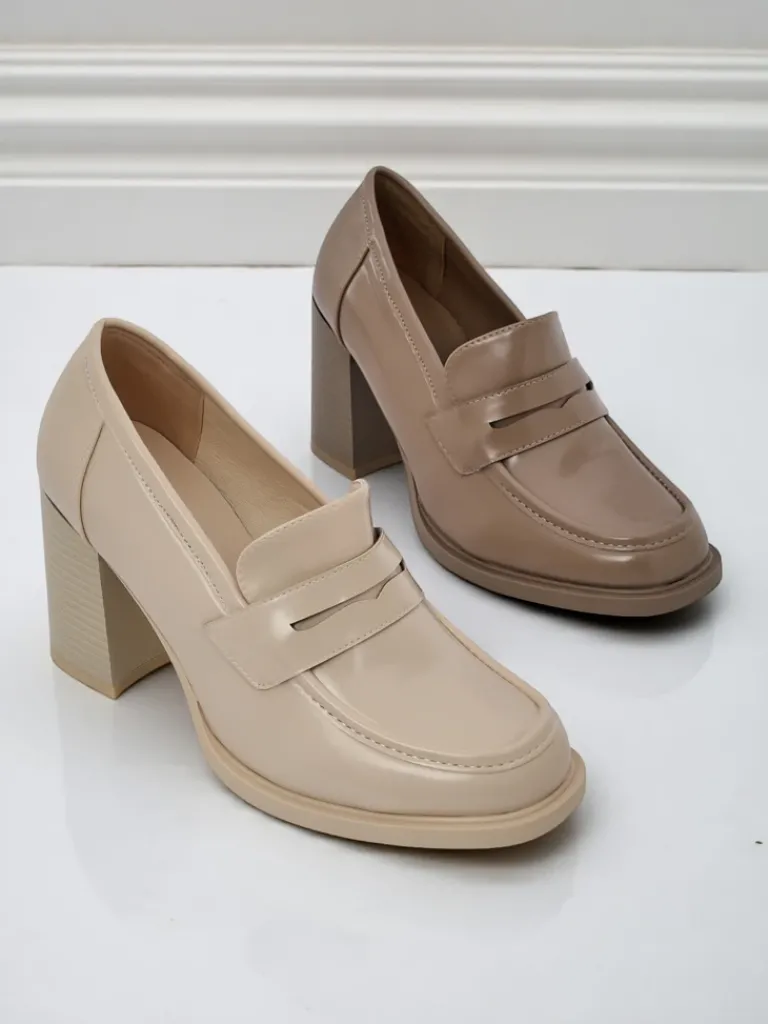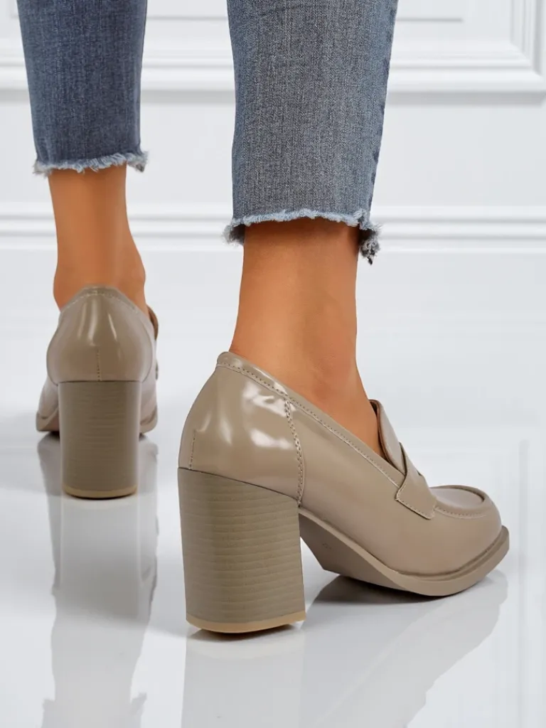 - Klasyczne damskie mokasyny na obcasie. Model całościowo wykonany z eko skóry. Obuwie posiada subtelną ozdobę na cholewce. Idealna baza na co dzień!