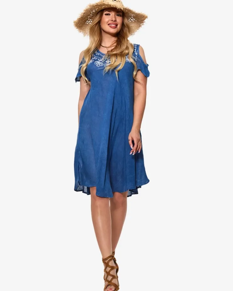 Discount Niebieska damska narzutka plażowa typu sukienka z haftem Narzutka Plażowa|Sukienki Letnie