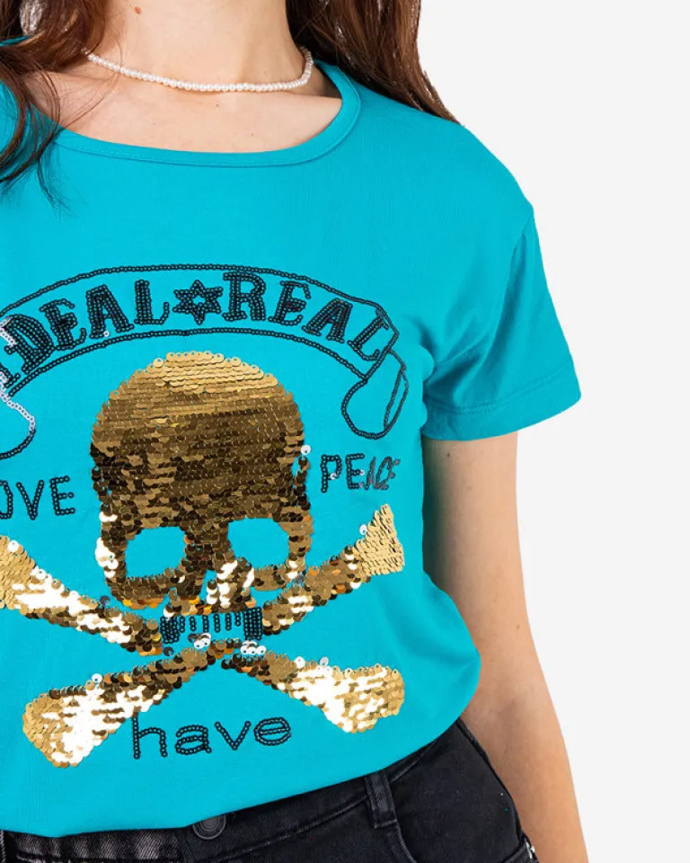 - Cudowny t-shirt damski z okrągłym dekoltem i krótkim rękawem. Przednia część koszulki jest zdobiona cekinami w kształcie korony. Będzie świetną ozdobą do codziennych stylizacji. UWAGA: Dokładność pomiaru (+/-) 1 cm.