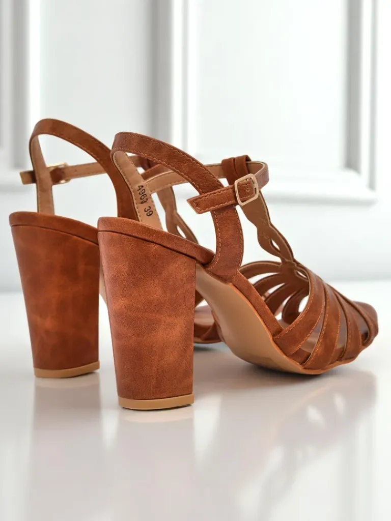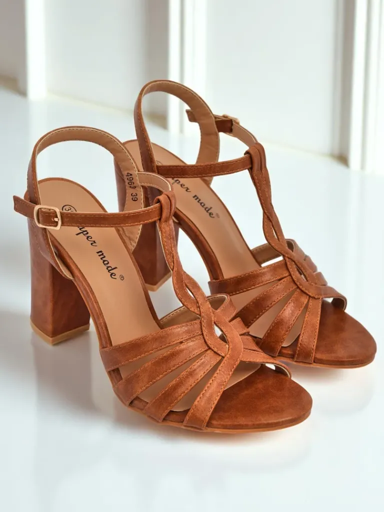 - Damskie sandałki na wysokim słupku wykonane ze skóry ekologicznej, z ozdobnymi plecionymi paseczkami i zapięciem na sprzączkę. Stylowe i wygodne – idealne na letnie wyjścia, imprezy i eleganckie okazje.