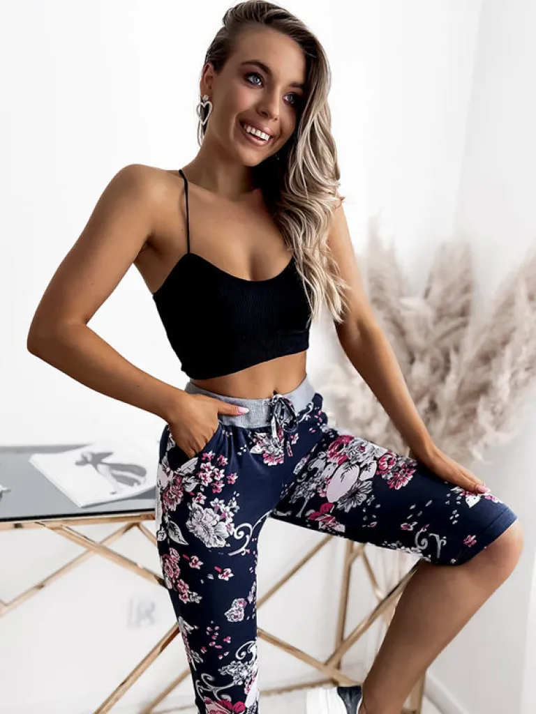 - Wygodne damskie spodenki 3/4 z kieszeniami, wykonane z tkaniny bawełnianej w kwiaty. Model posiada gumę oraz wiązane toczki w pasie. UWAGA: Dokładność pomiaru (+/-) 1 cm.
