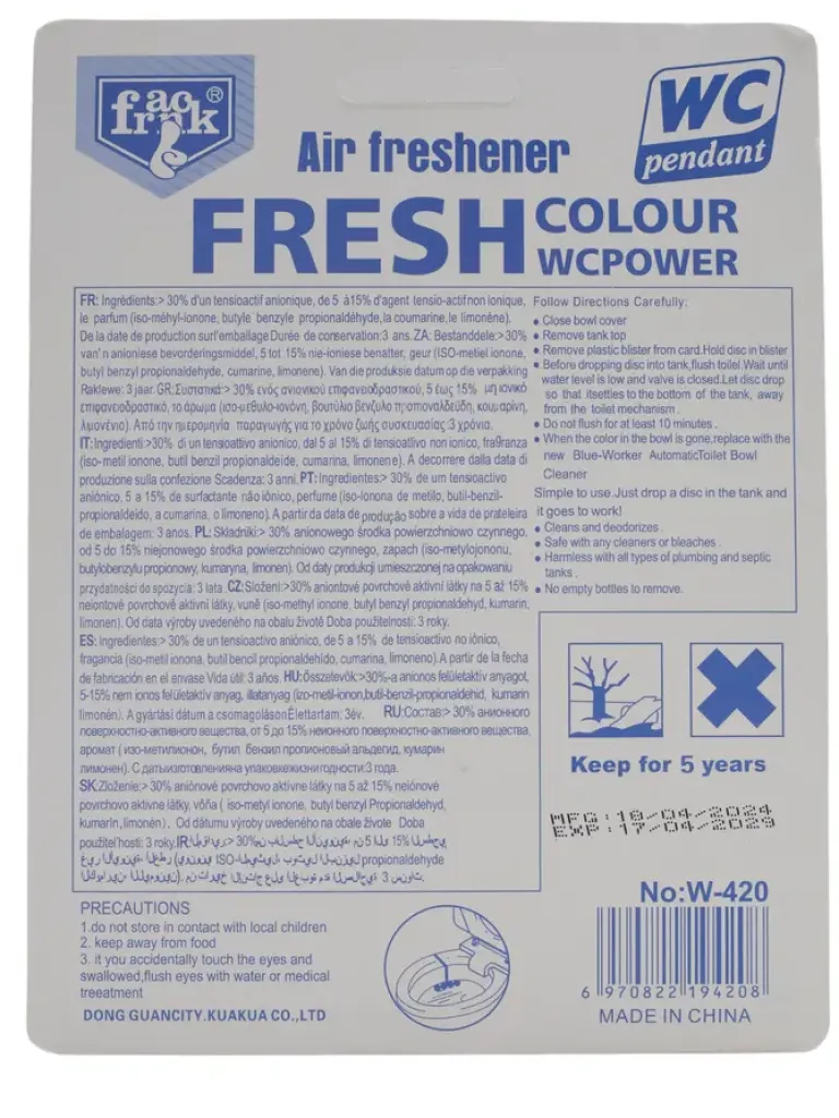 - Zawieszka do WC skutecznie odświeża i oczyszcza toaletę przy każdym spłukaniu, pozostawiając przyjemny zapach i pomagając w utrzymaniu czystości. Prosta w użyciu i długa w działaniu.