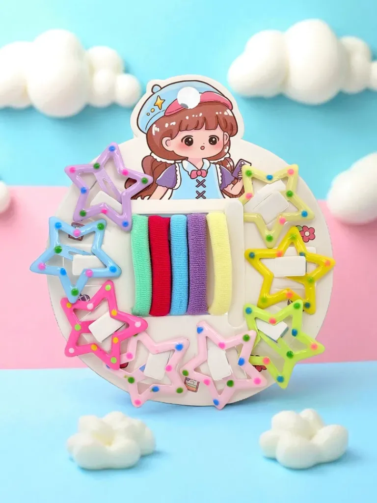 - Zestaw kolorowych spinek i gumek do włosów dla dzieci – akcesoria Stella Bambina, modne dodatki do każdej stylizacji.