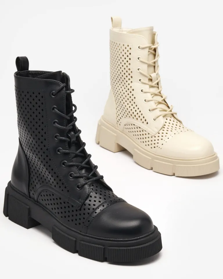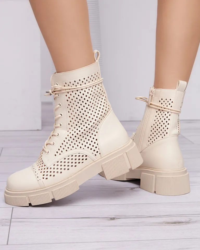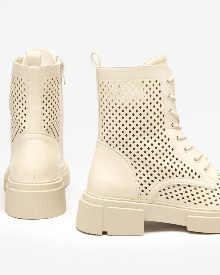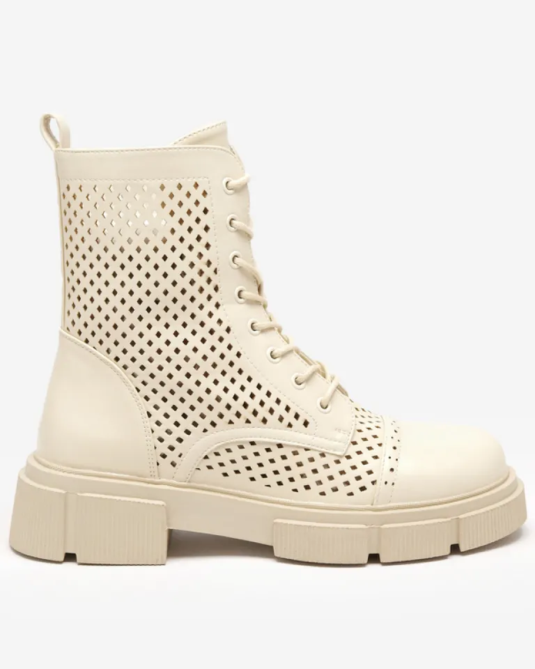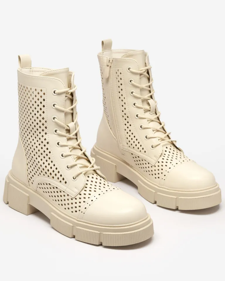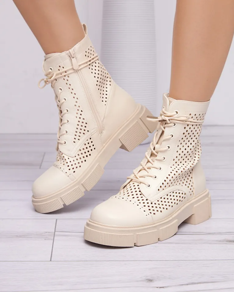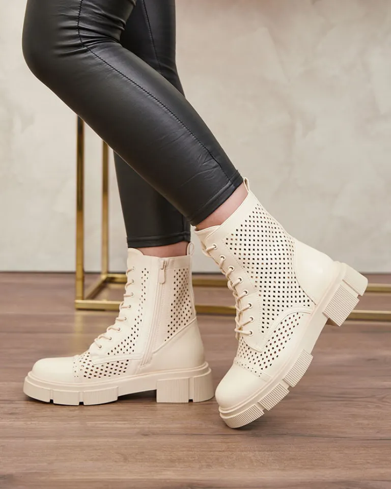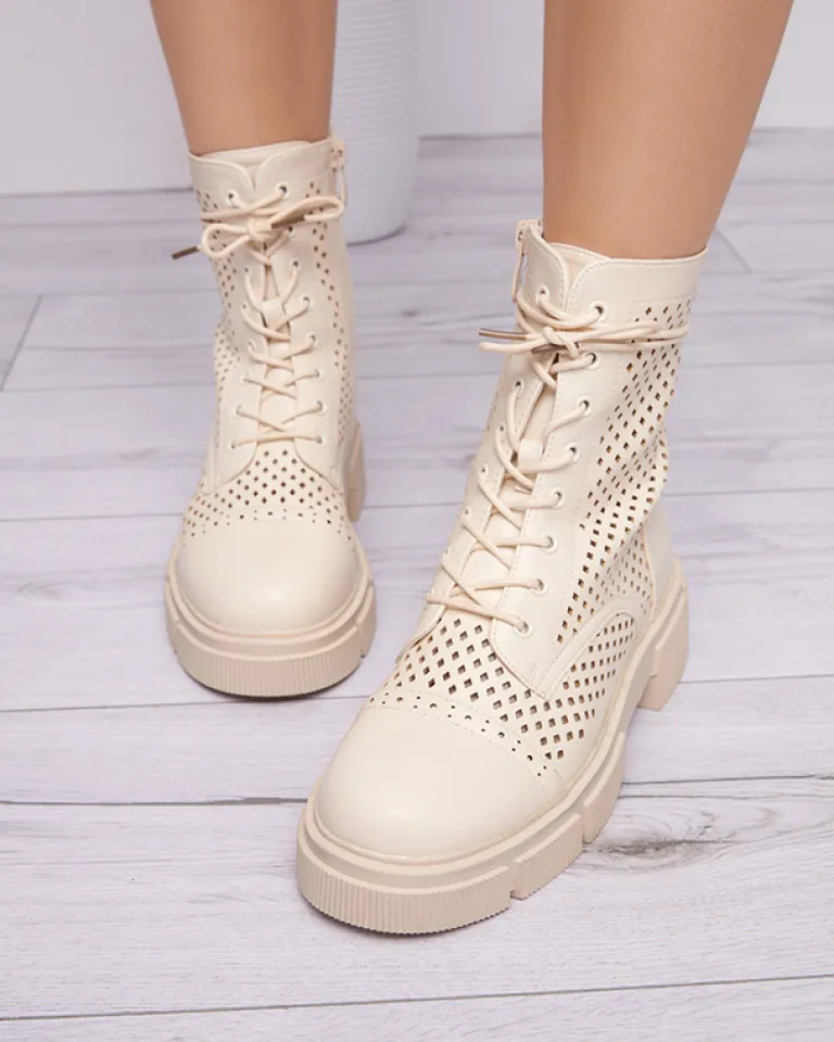 - Wyjątkowe botki damskie wykonane ze skóry ekologicznej wykończonej ażurem. Środek buta wyłożony skórą ekologiczną. Obuwie jest sznurowane i zapinane suwakami po bokach. Idealna para dla looków w stylu boho. BEŻOWE DAMSKIE BUTY BOTKI NIEOCIEPLANE ROLIKA