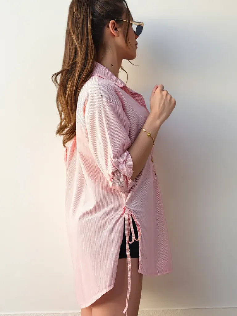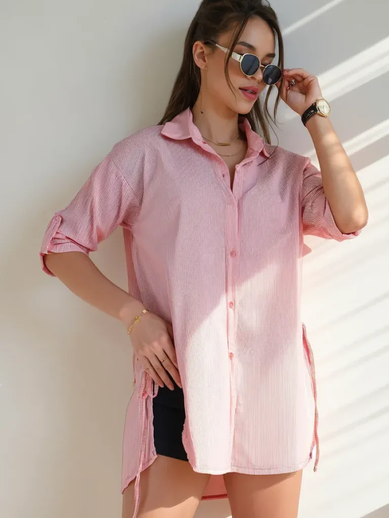 Hot Bawełniana dłuższa damska koszula w paski z wiązaniem w talii Bluzki / Koszule / Koszulki
