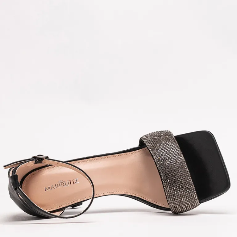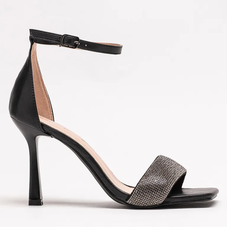 - Przepiękne damskie sandały na szpilce, zdobione cyrkoniami. Para w całości wykonana ze skóry ekologicznej. Wokół kostki ma regulowany paseczek zapinany na sprzączkę.