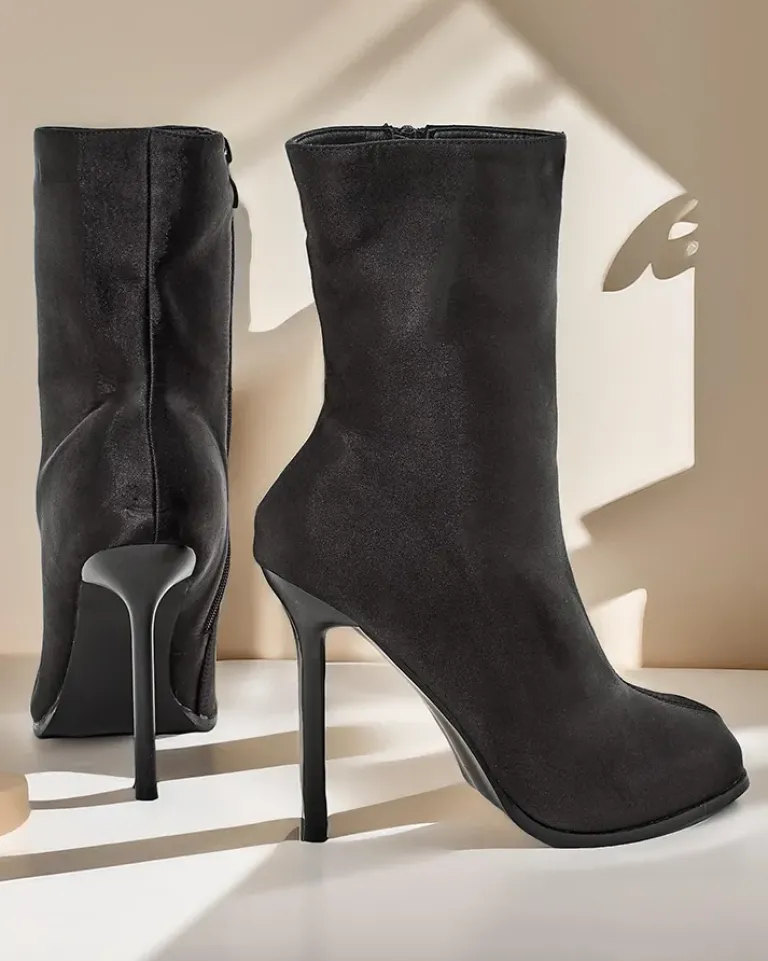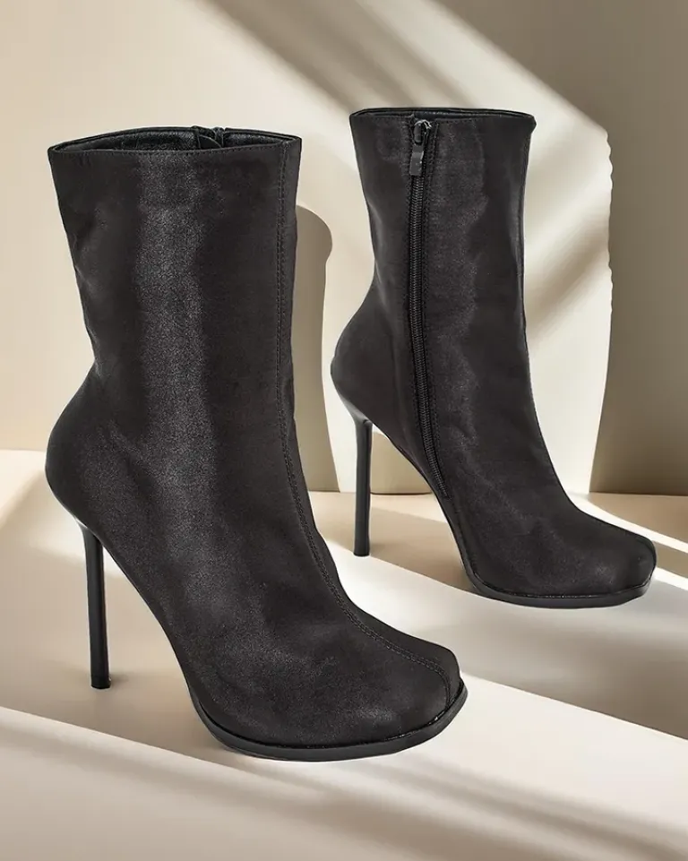 - Eleganckie botki na szpilce wykonane z tkaniny a’la satyna, zapinane na suwak. Model posiada kwadratowy nosek. Świetne buty do jesiennych kreacji!