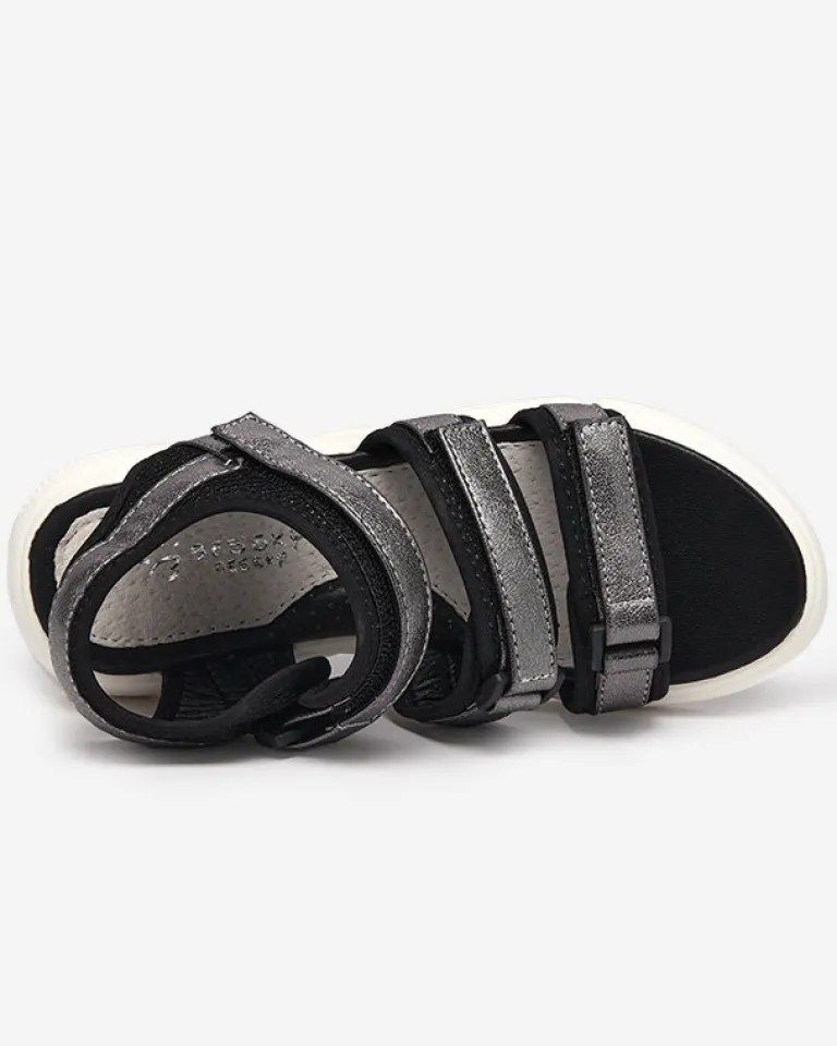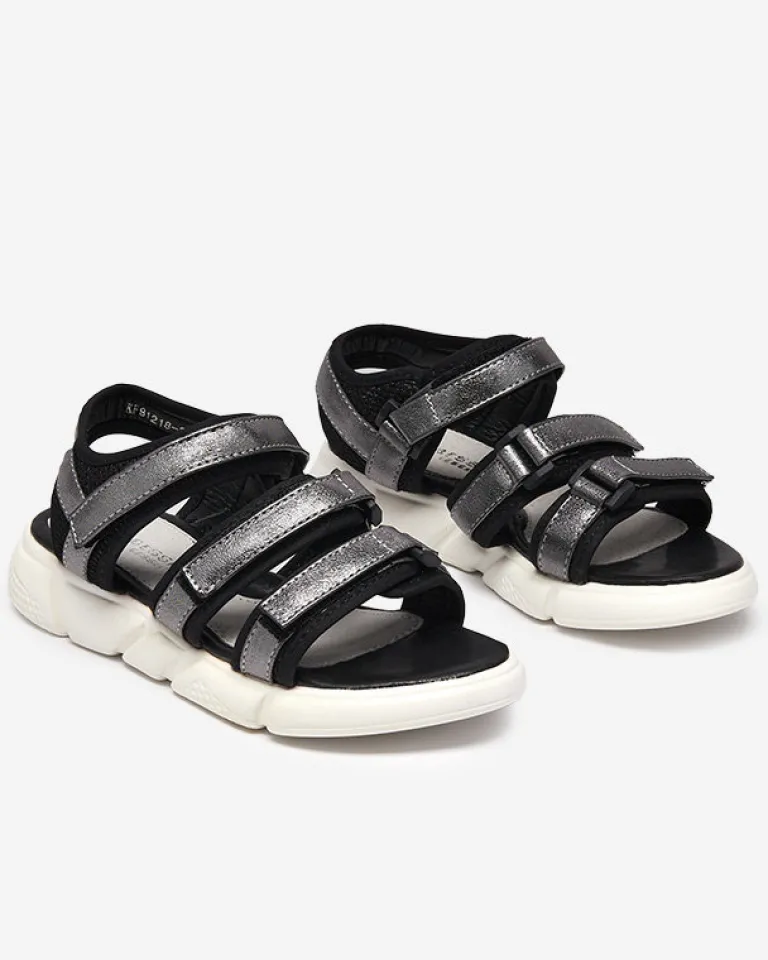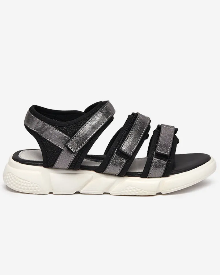- Klasyczne dziewczęce sandałki wykonane ze skóry ekologicznej z błyszczącym wykończeniem. Wkładka również eko skórzana. Szerokość obuwia można regulować za pomocą rzep. Doskonale sprawdzą się na co dzień!