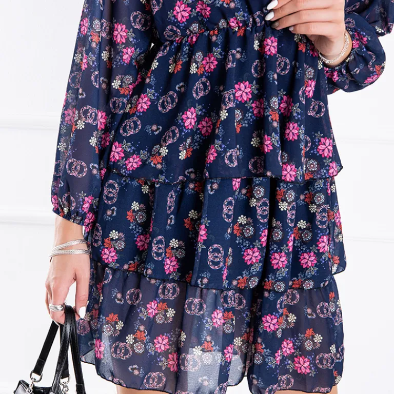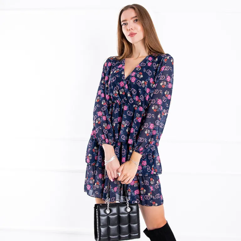 - Sukienka damska przed kolano, z długim rękawem oraz falbankami. Dekolt w serek oraz piękny i modny print w kwiaty. Super wybór na co dzień czy do pracy!